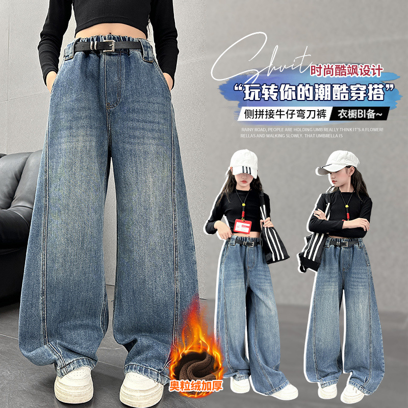 女童牛仔裤子2025秋冬新款大童洋气网红阔腿裤女孩加绒直筒裤跨境