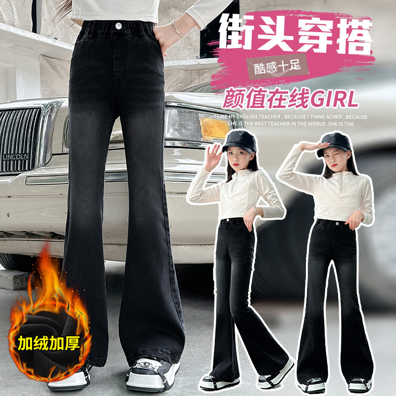 女の子用のラッパズボン秋冬2024新型子供用の黒いズボンは洋気の大きい子供用のベルベットの高腰のジーパンを修理します。