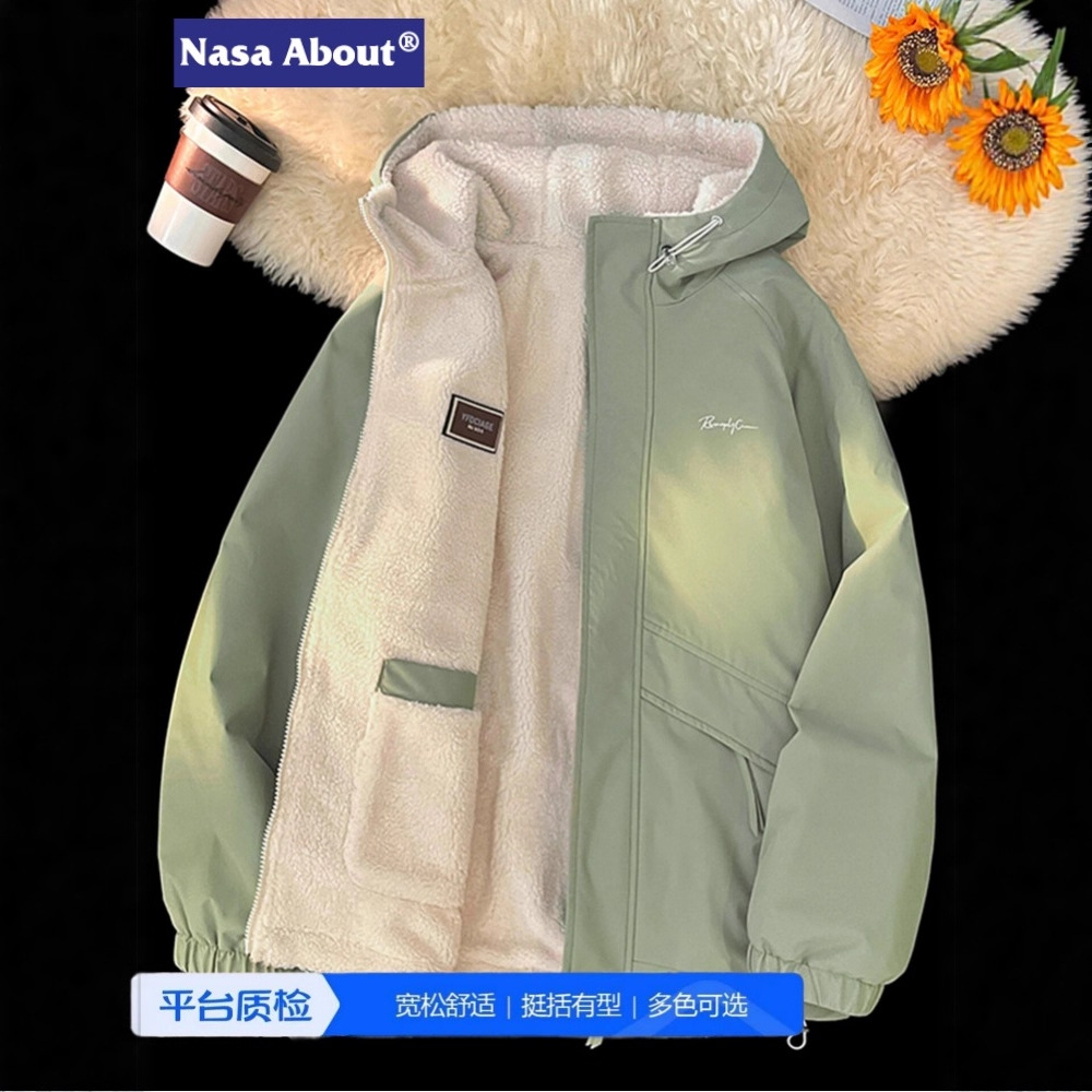 NASA ABOUT羊羔绒连帽外套男秋冬加绒加厚双面穿宽松冬装休闲夹克