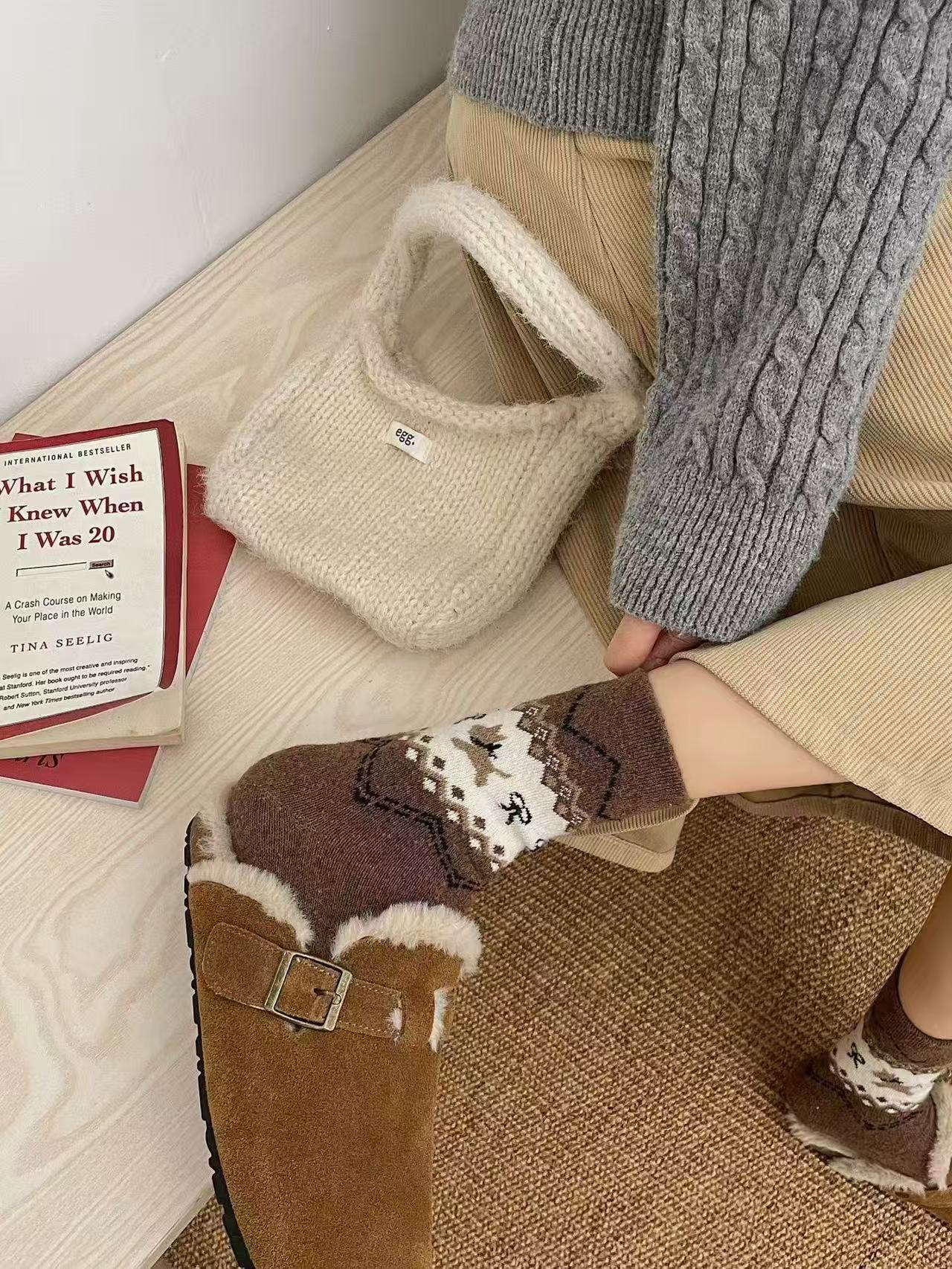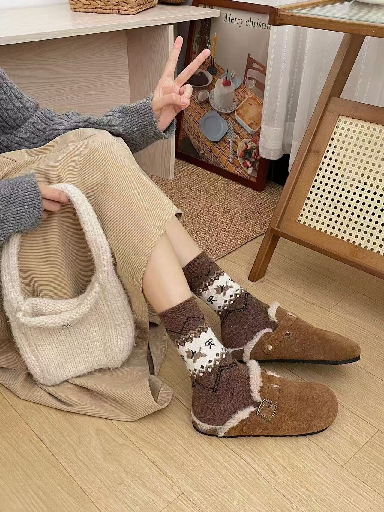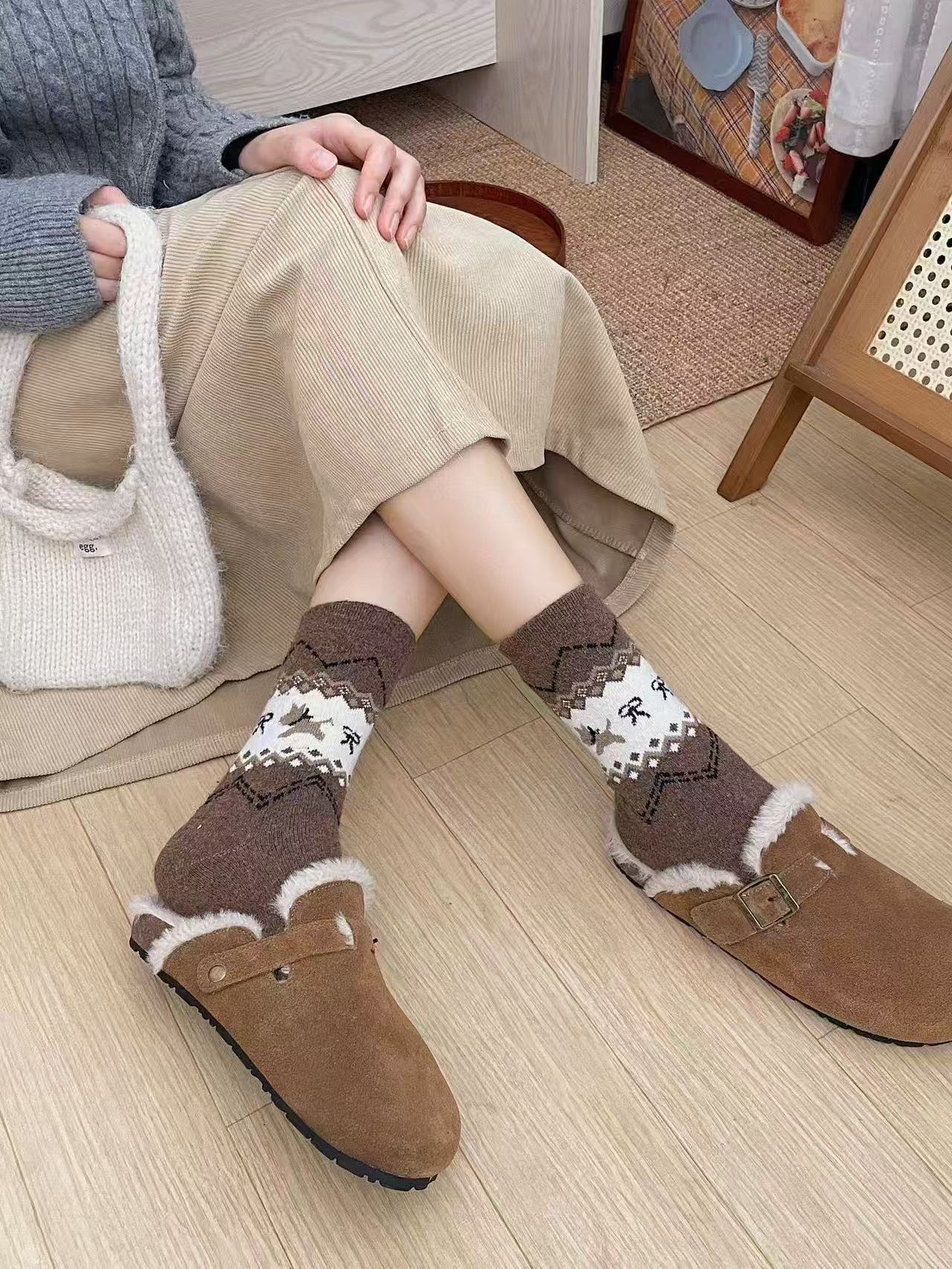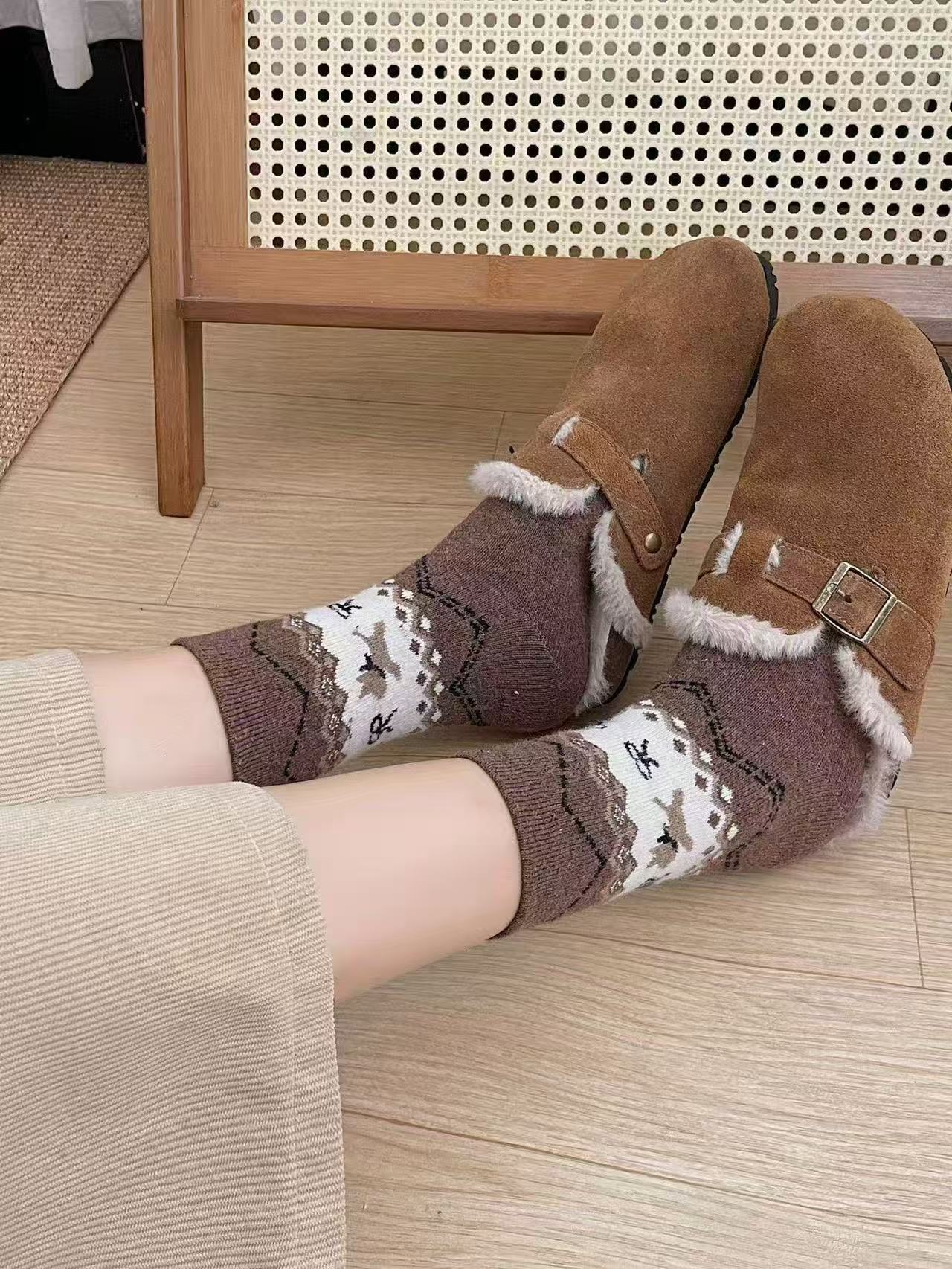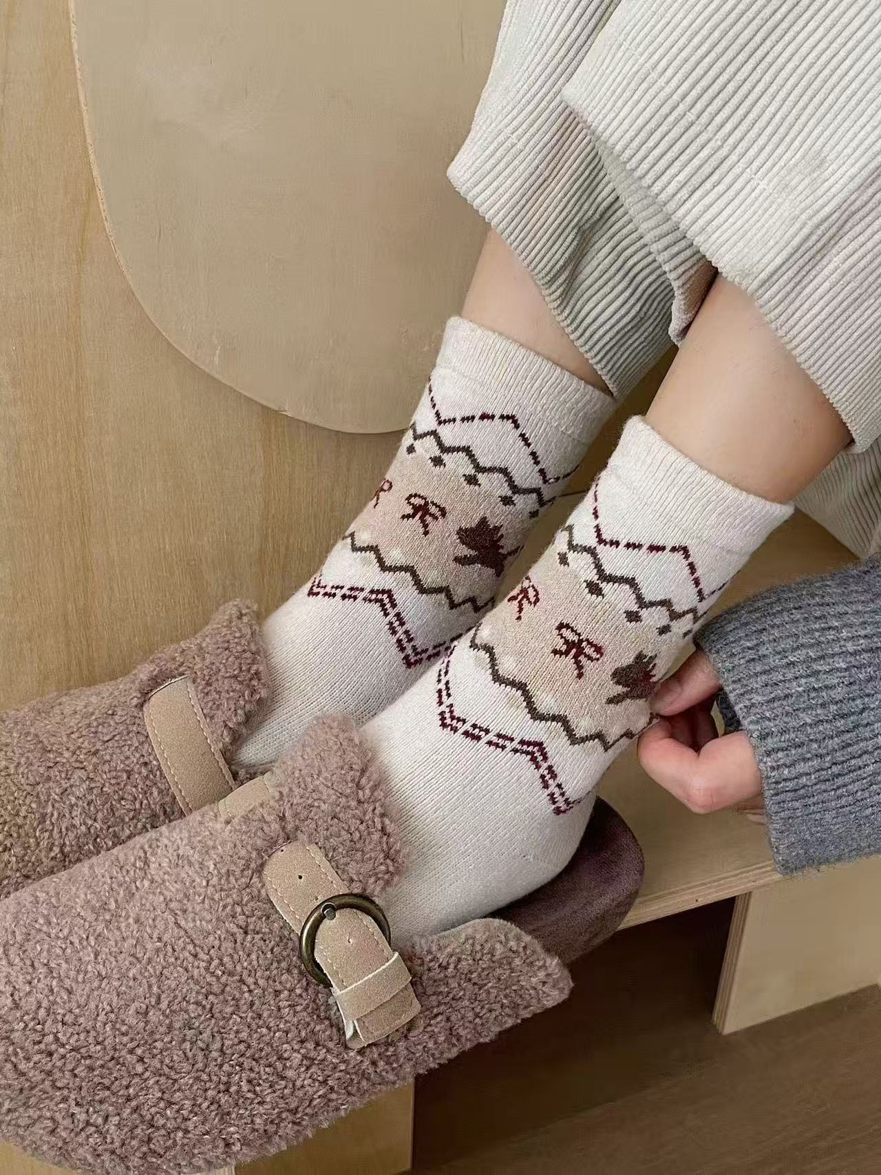 费尔岛菱格秋冬新款保暖日系复古名族风羊毛袜厚款堆堆袜子月子袜