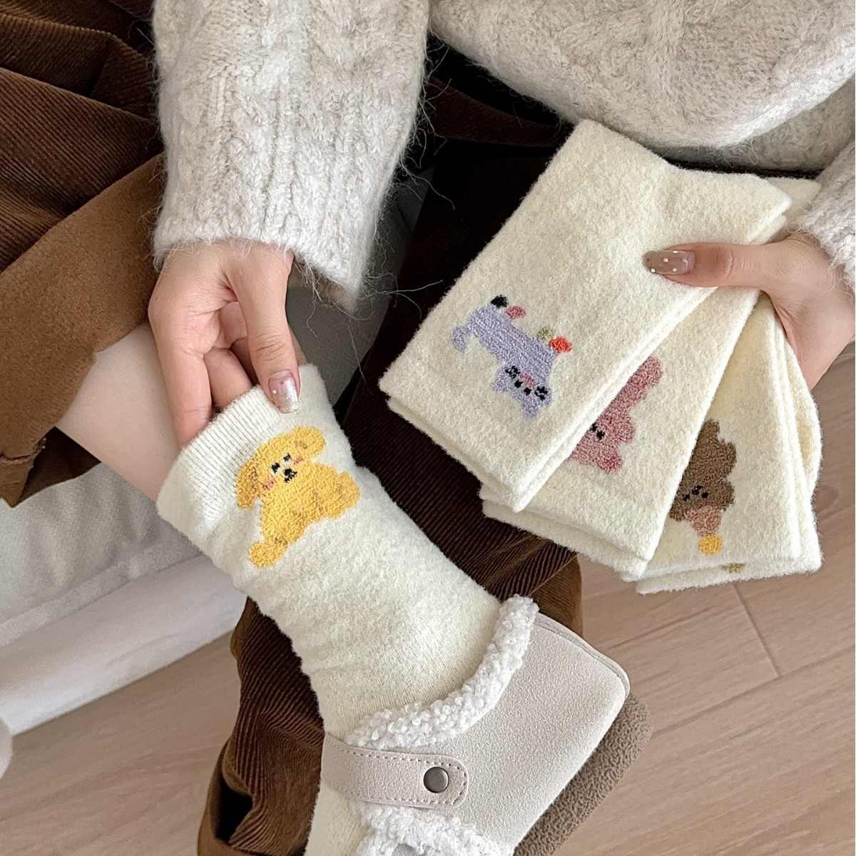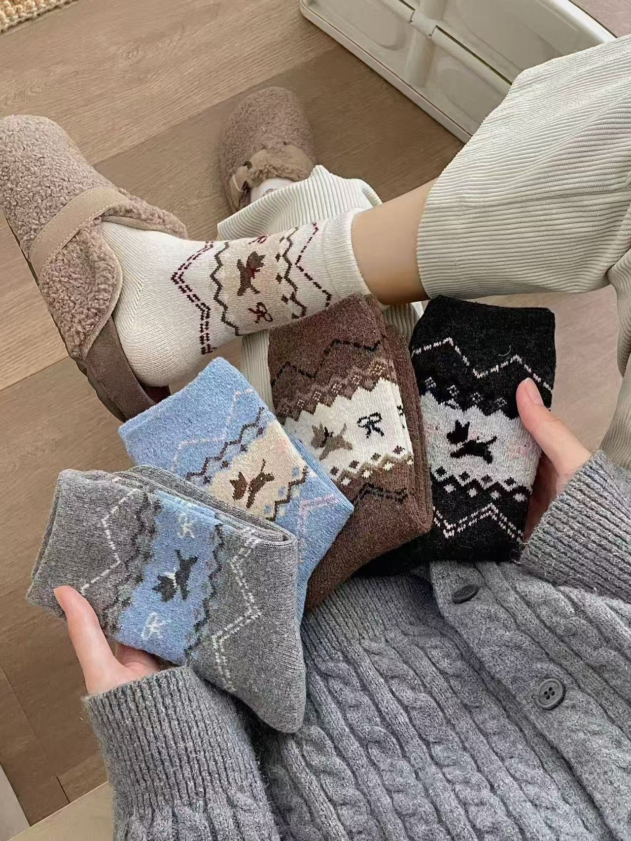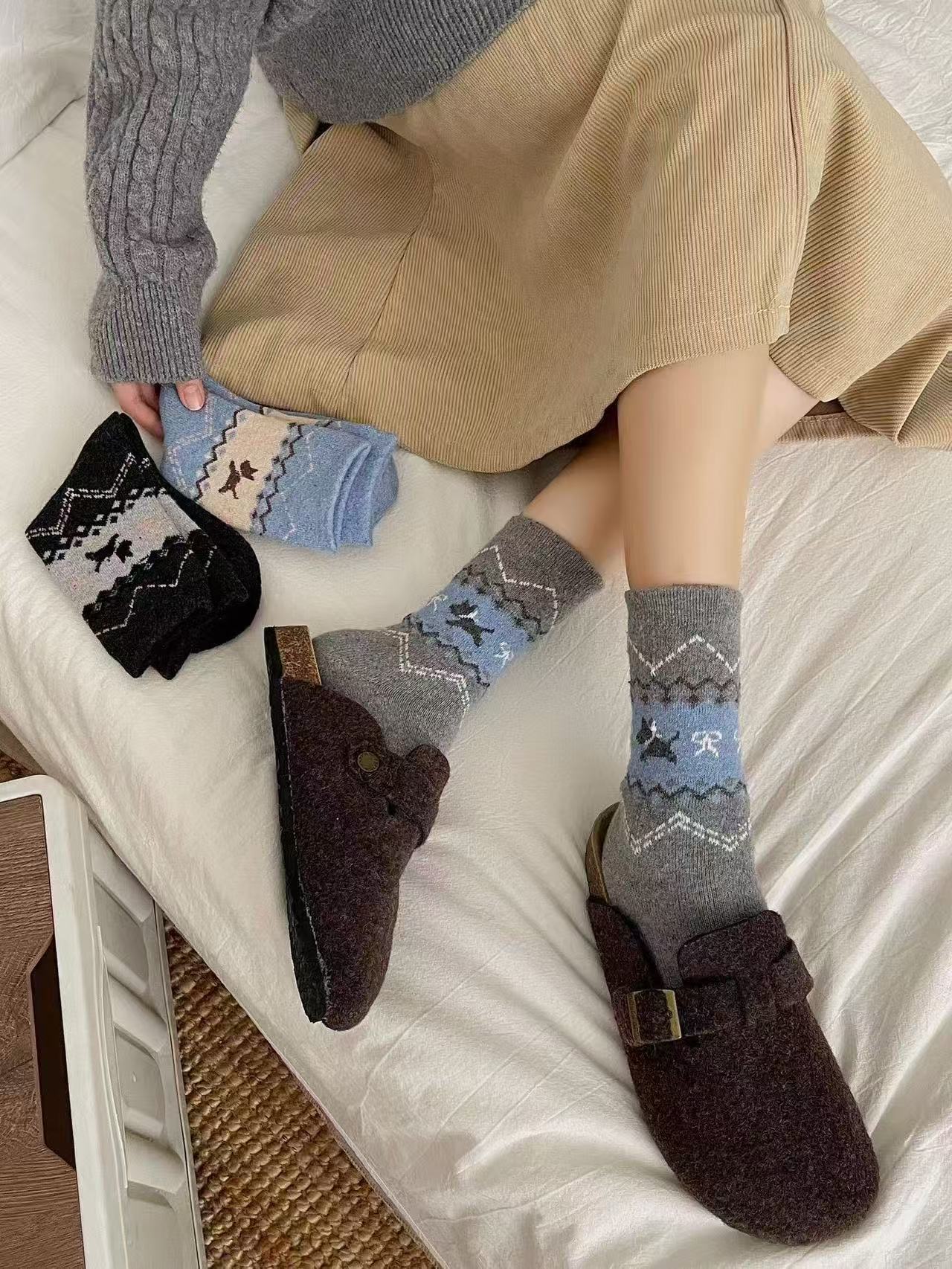 费尔岛日杂风小狗袜秋冬加厚保暖中筒袜长袜堆堆袜子女可爱甜美袜