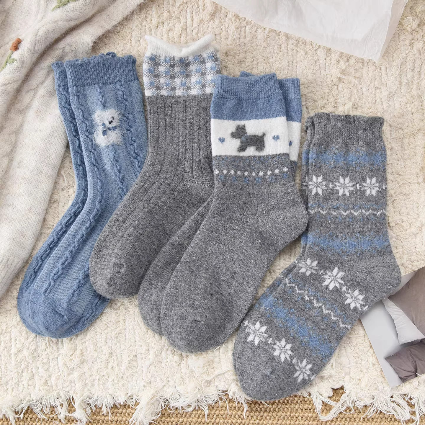 羊毛袜子女秋冬季加绒加厚保暖蓝灰色中筒堆堆袜可爱卡通冬天长袜
