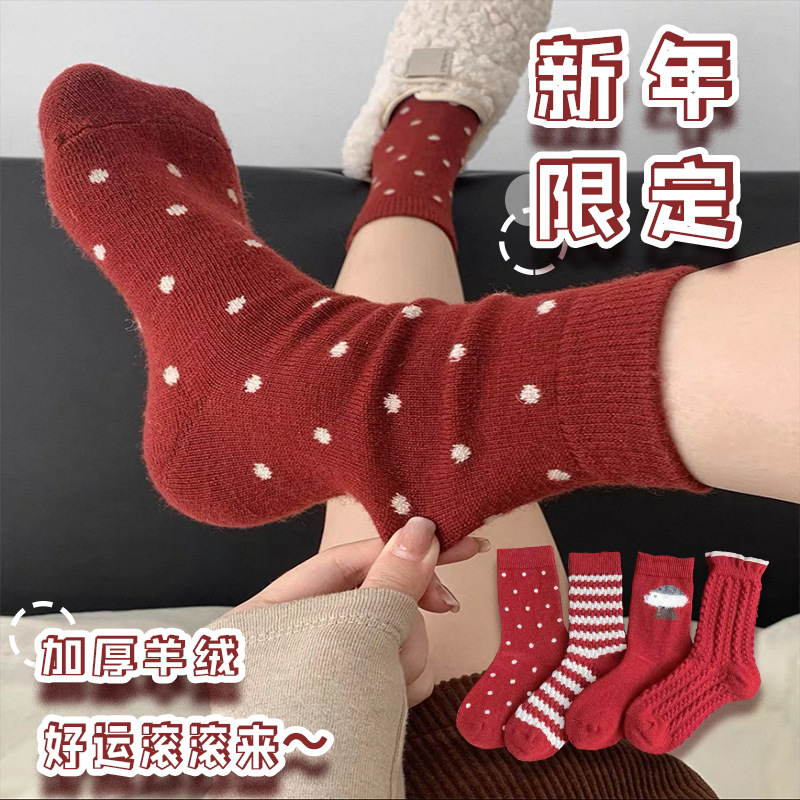 新年喜庆植绒小狗羊毛本命年红色长袜中筒软糯糯堆堆复古ins冬天