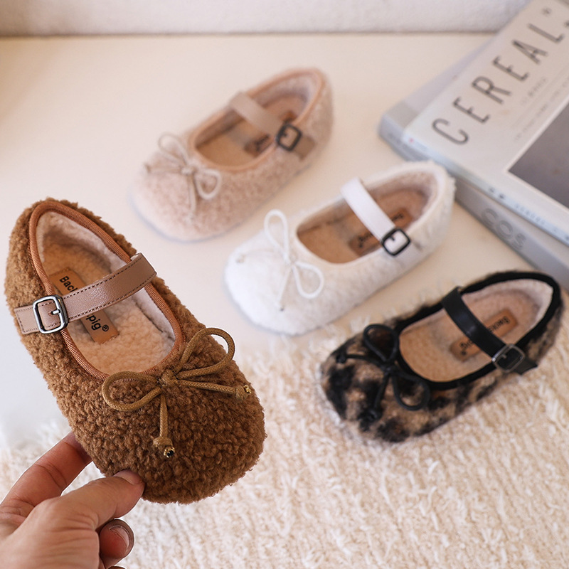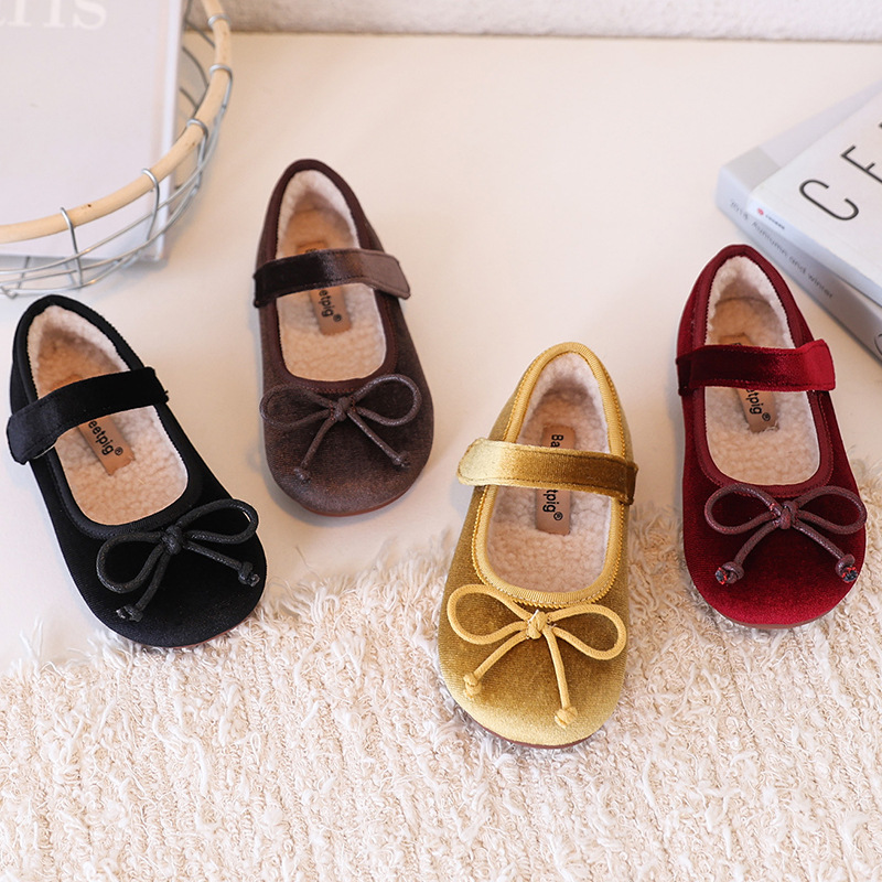 跨境韩版童鞋2026冬季加绒保暖宝宝鞋金丝绒蝴蝶结公主鞋儿童棉鞋
