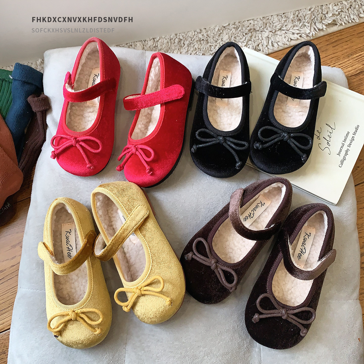 リボン秋と冬のベルベットの子供靴、子供用の浅い口の子供用綿の靴、女の子のベルベットの靴、ベビープリンセスシューズ