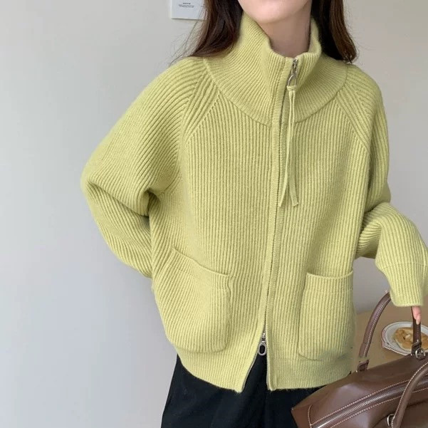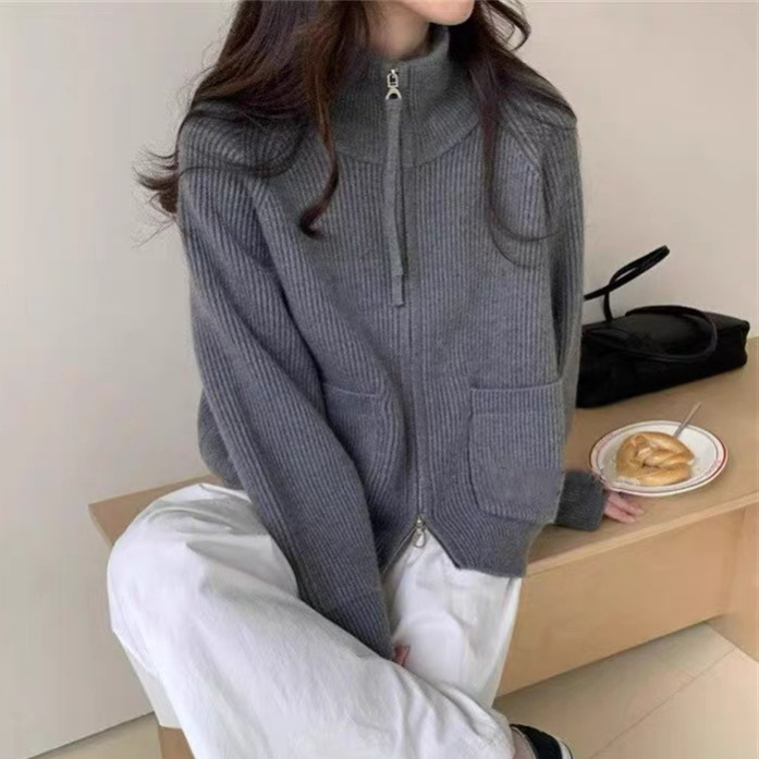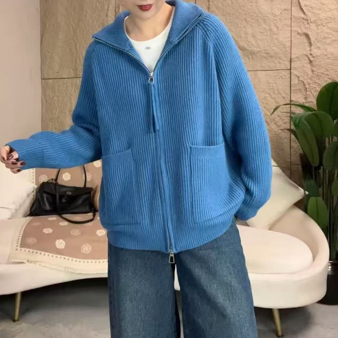 宽松大口袋立领双拉链针织衫外套女2025秋冬韩系慵懒风针织衫上衣