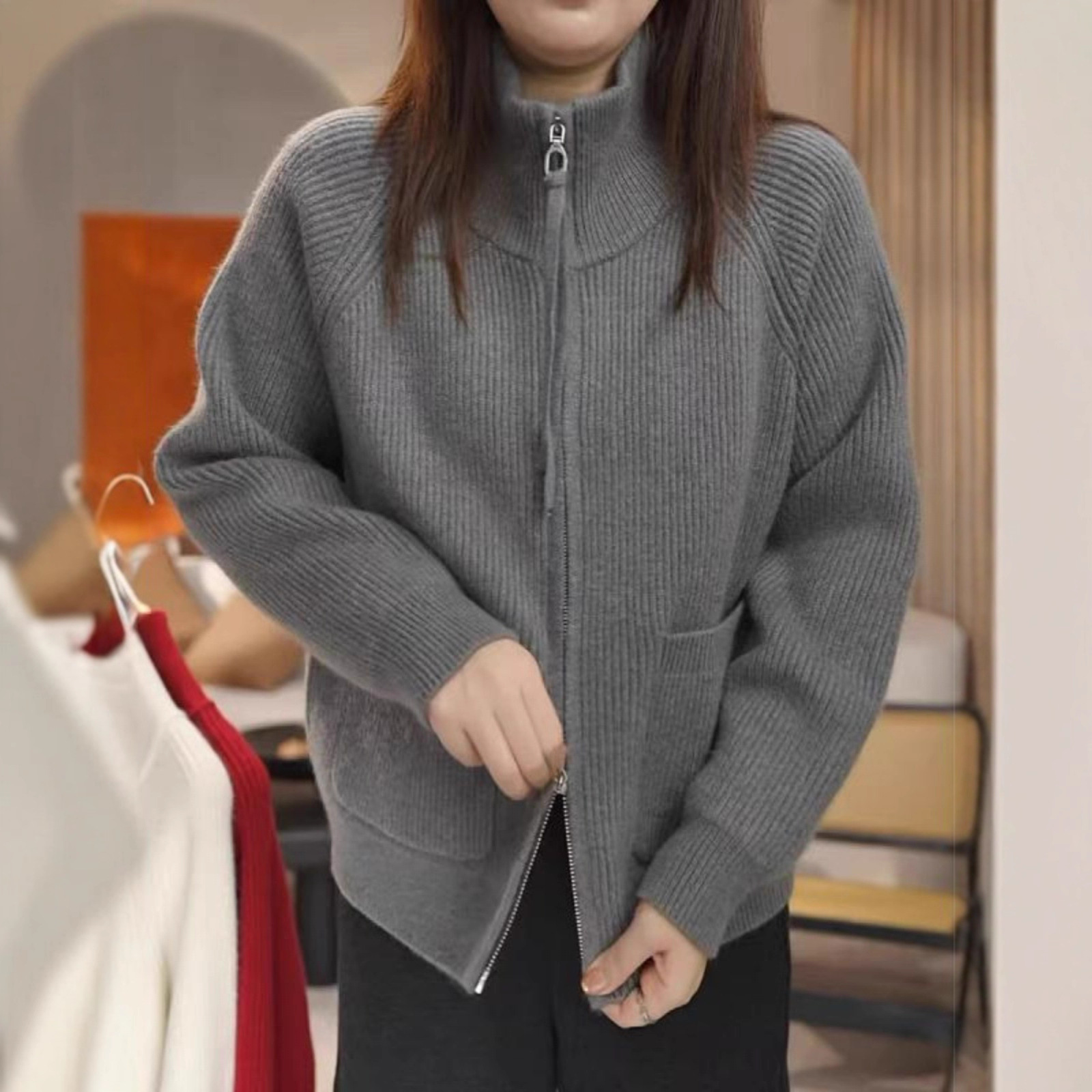 立领双拉链口袋针织开衫外套秋冬新款时尚百搭厚版休闲毛衣上衣女