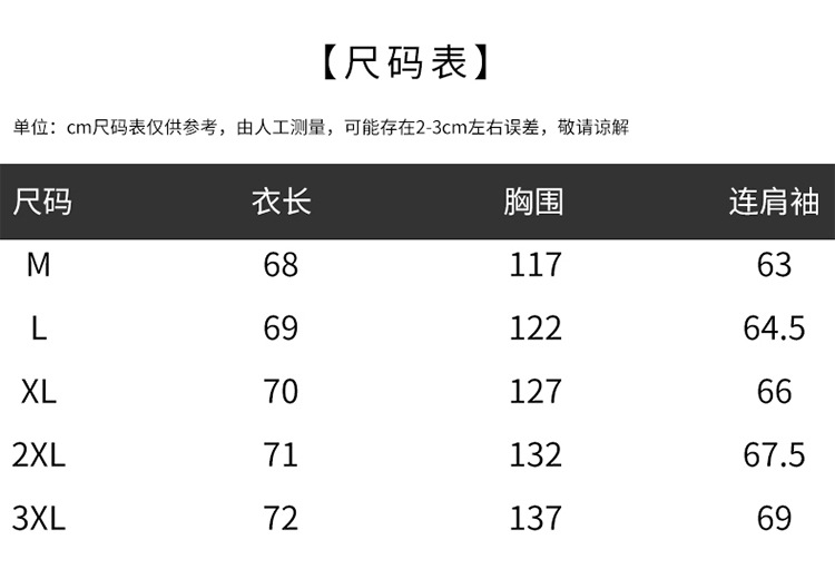尺码 M建议【90--105】斤,L建议【105--120】斤,XL建议【120--135】斤,2XL建议【135--150】斤,3XL建议【150--165】斤