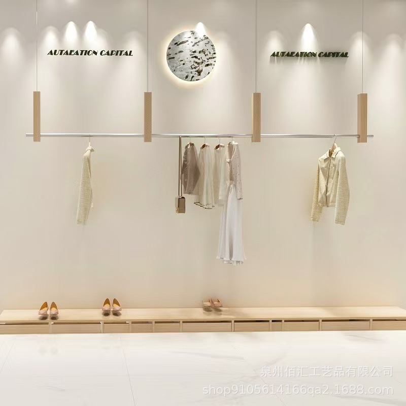 洋服店ステンレス上壁吊り棒実木吊り陳列棚胡桃木色吊り棚女装ショーウインドーハンガー