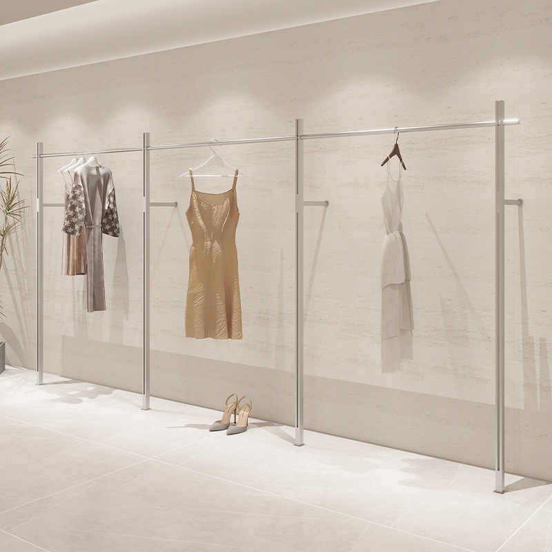 洋服店の展示棚の上の壁にハンガーを掛けてシンプルな男性女性服店の実木床ハンガーステンレス陳列棚