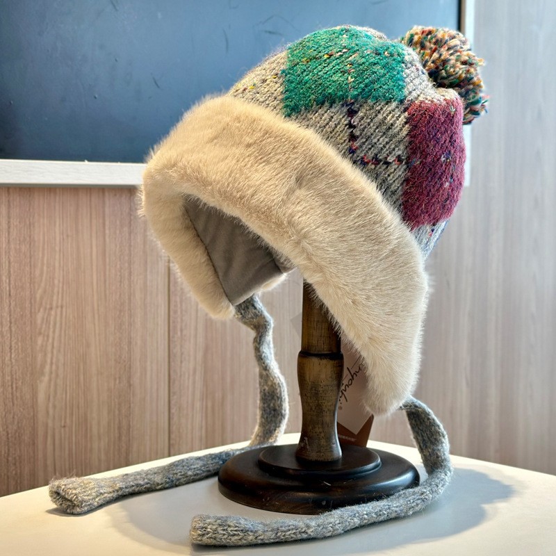 2025新款毛绒格子针织帽子女冬季保暖防寒护耳毛球雷锋帽双层加厚
