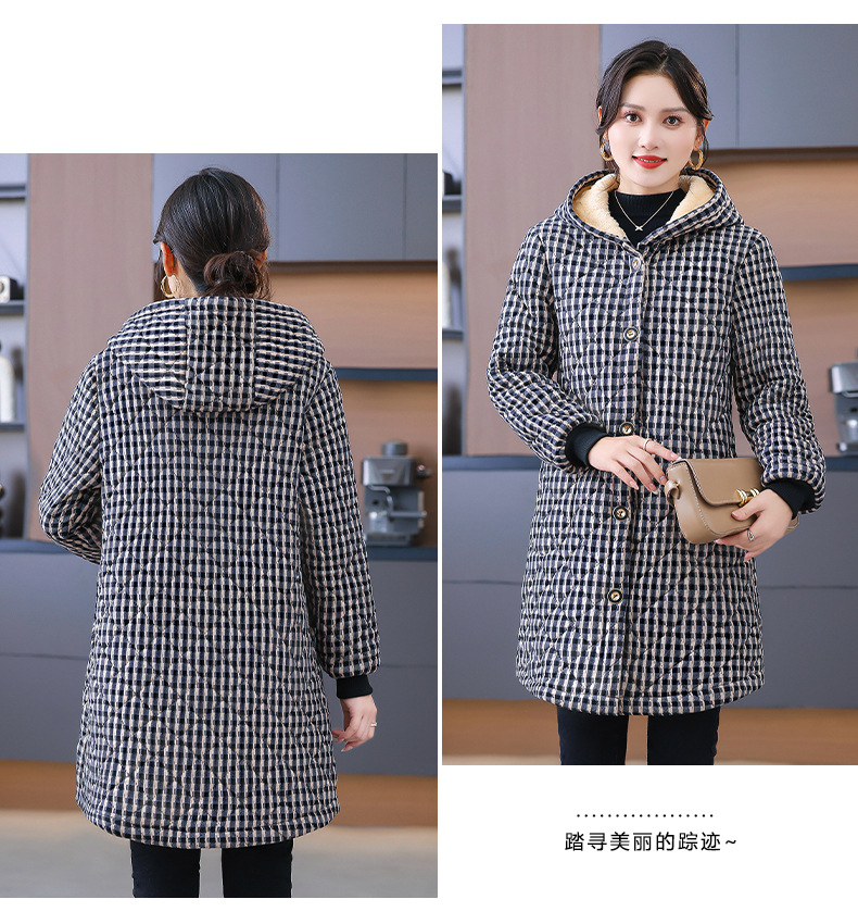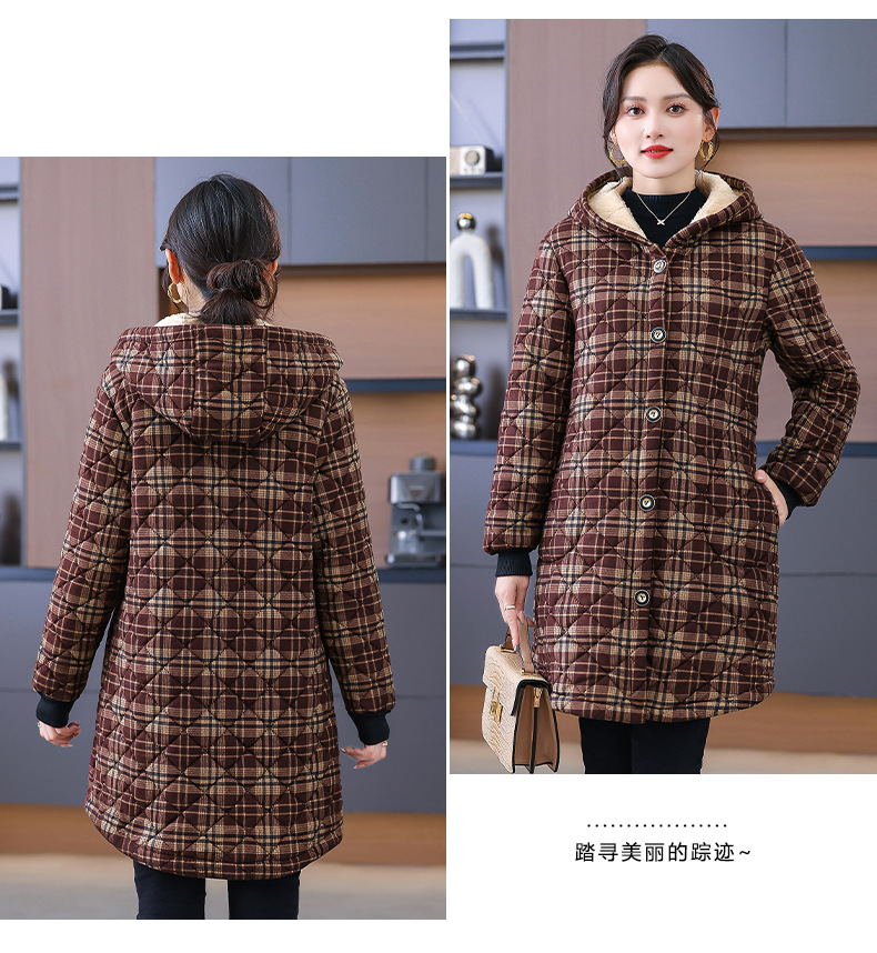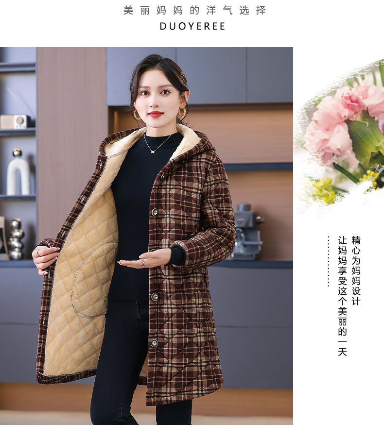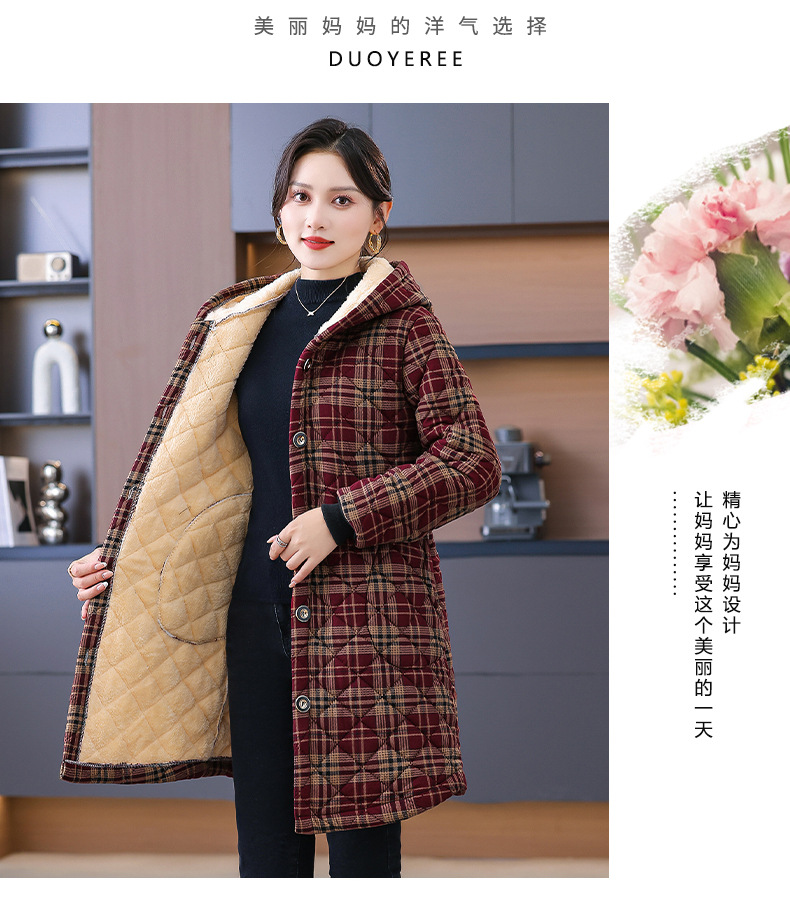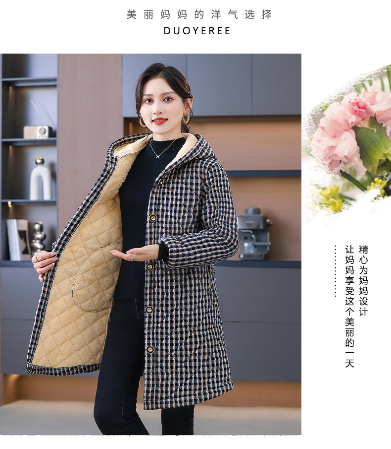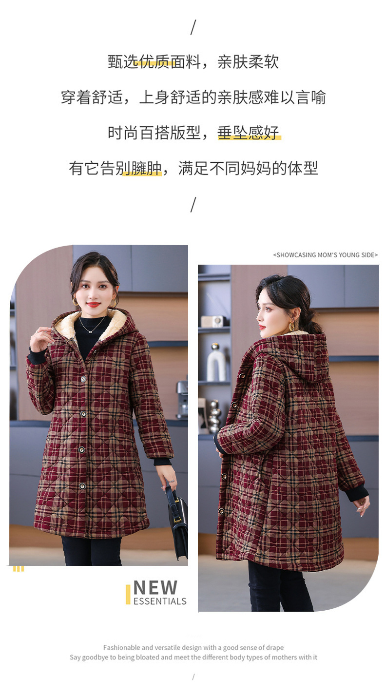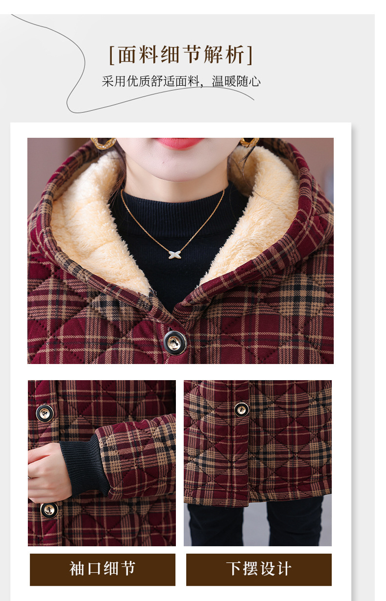 新款棉袄妈妈中老年保暖连帽棉衣棉服中长款洋气加绒加厚外套格子