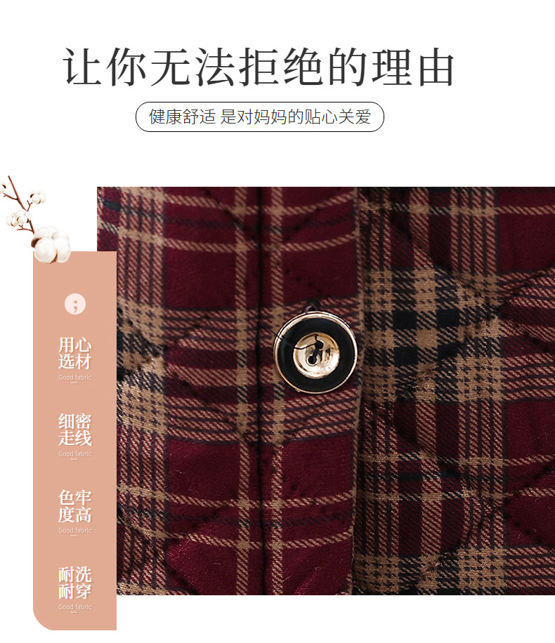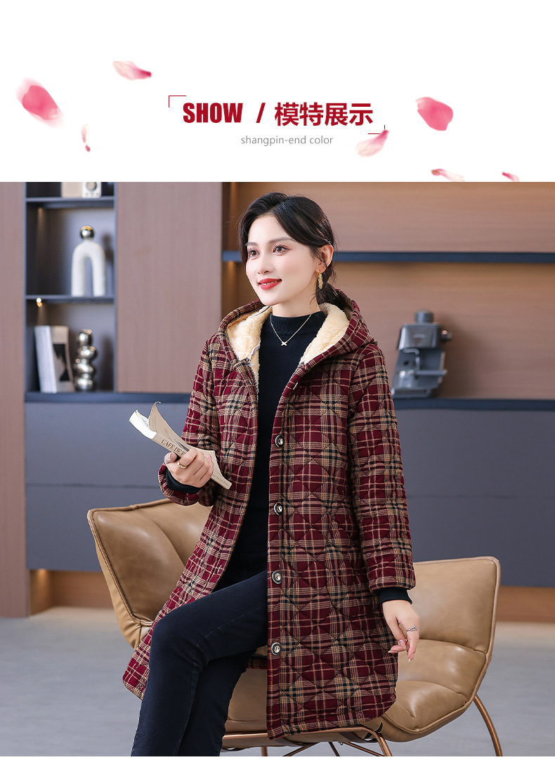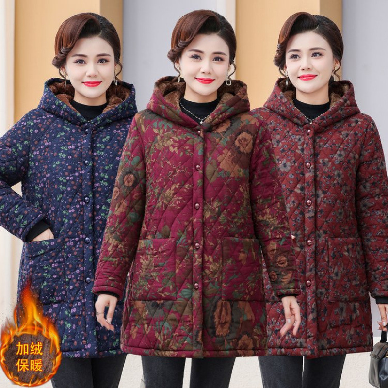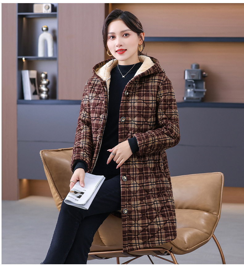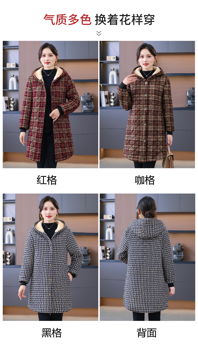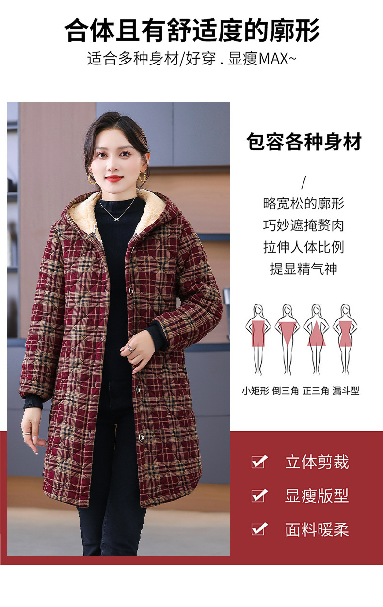 新款棉袄妈妈中老年保暖连帽棉衣棉服中长款洋气加绒加厚外套格子
