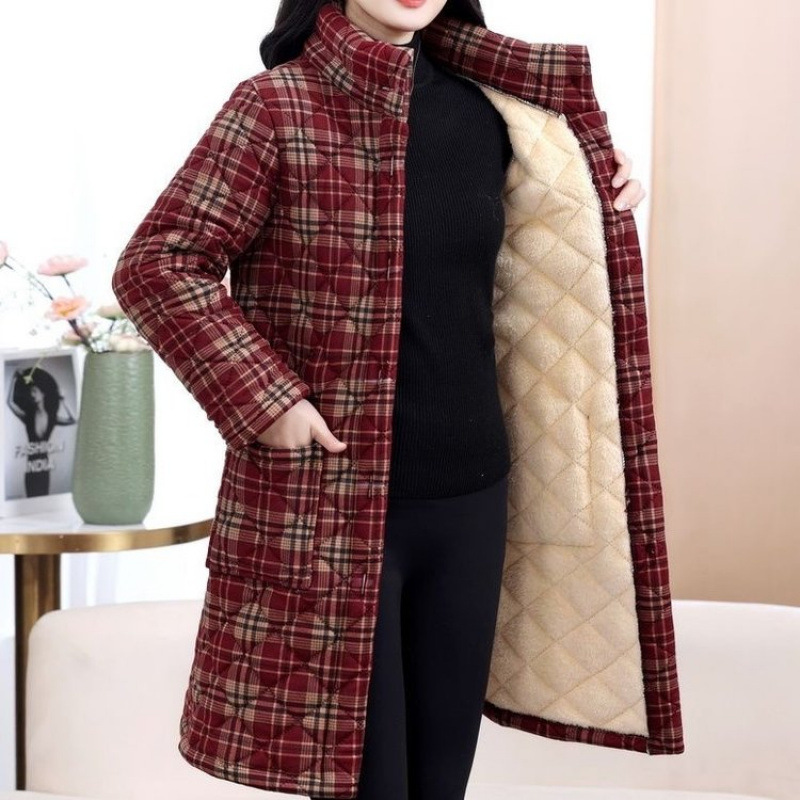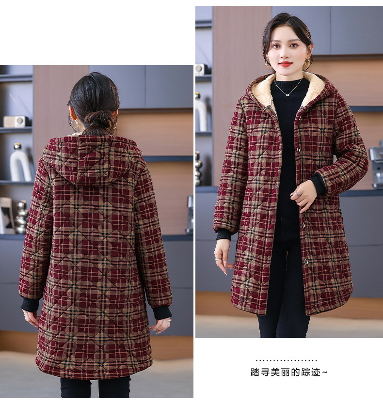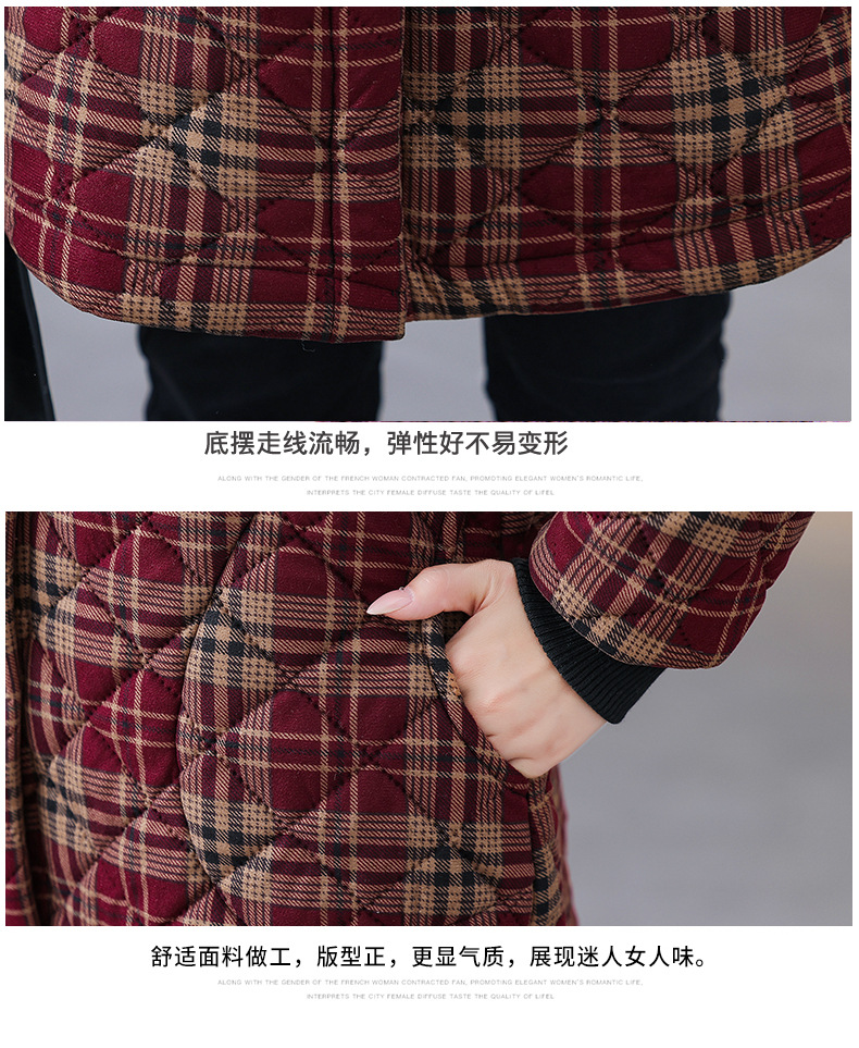 新款加绒大码中长款棉衣冬季棉服妈妈立领保暖加厚格子棉袄外套女