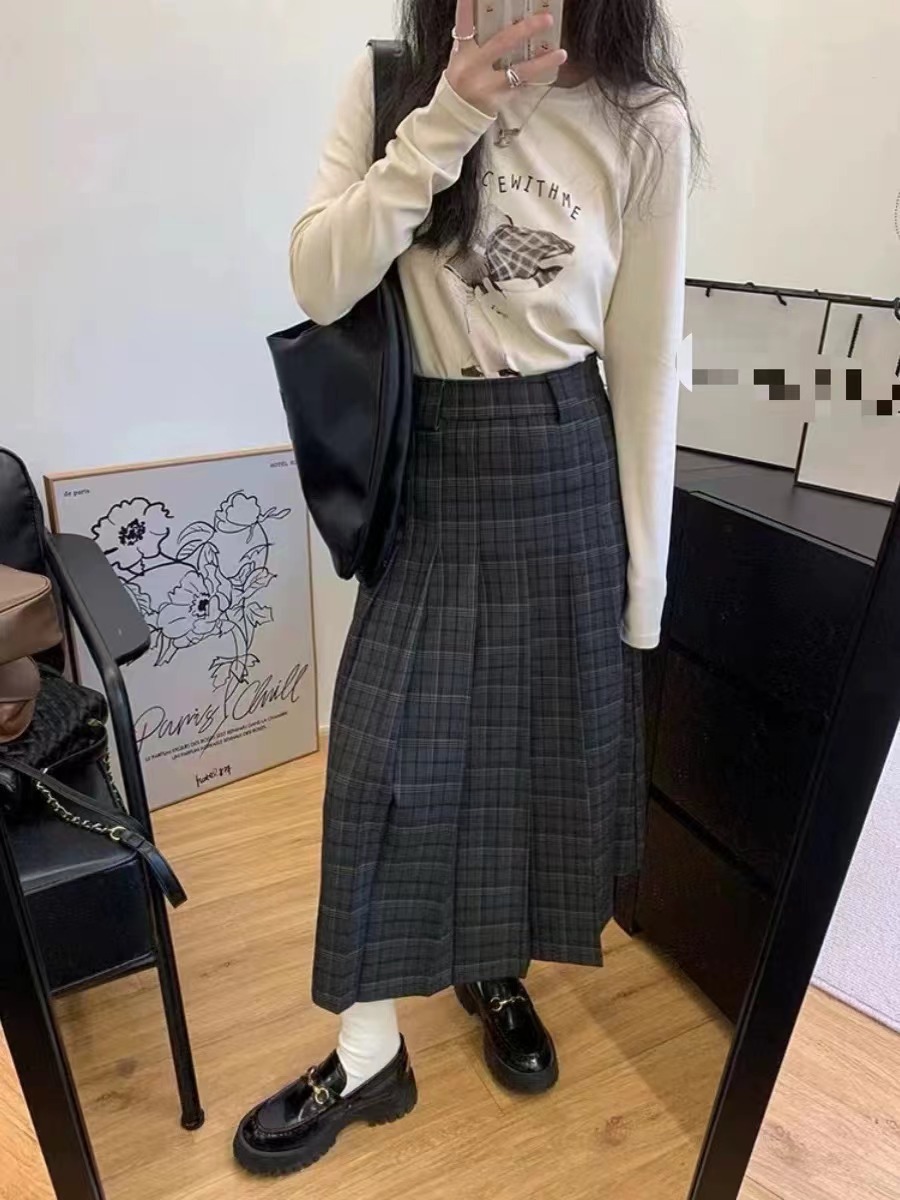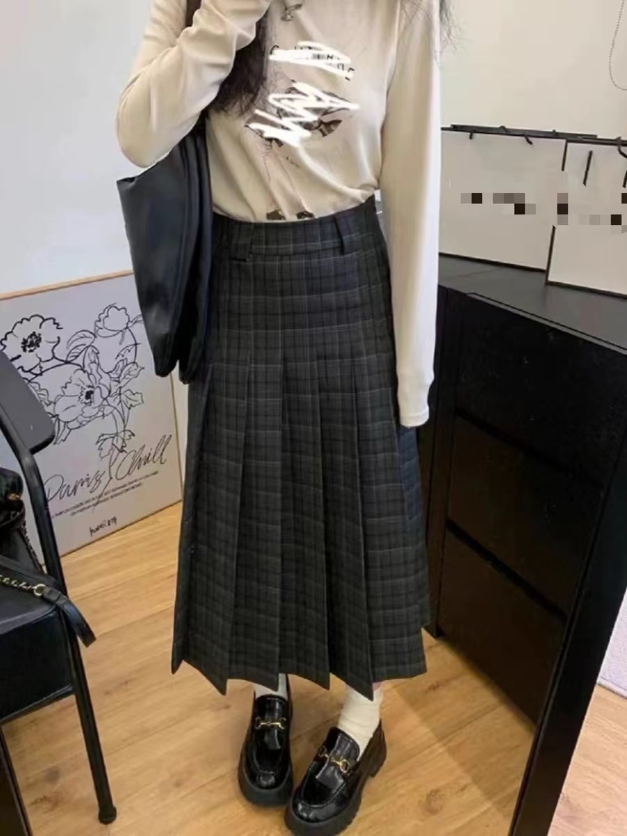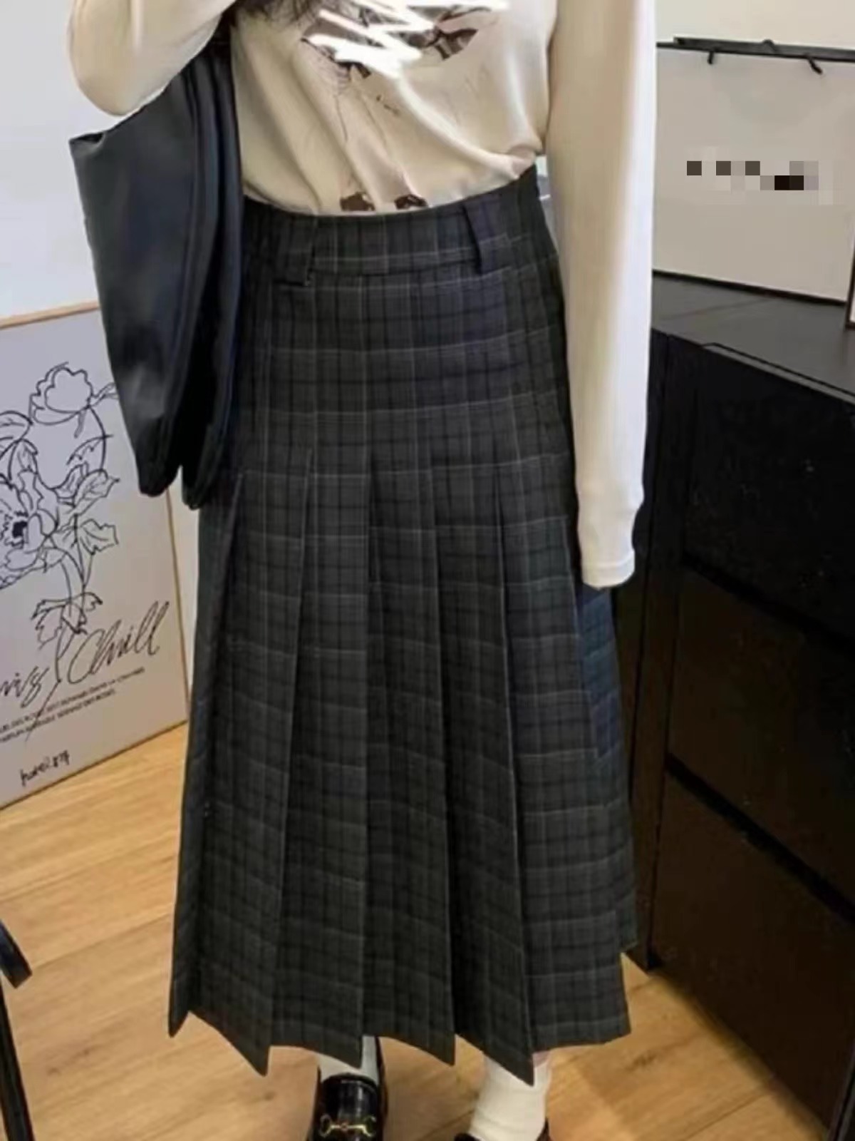 首尔高校生Luca格纹复古高腰a字裙灰色长裙秋冬压褶长款半身裙女