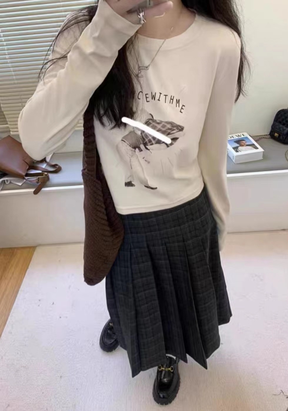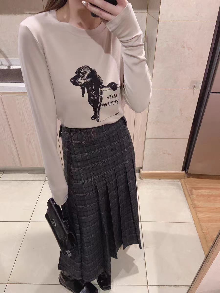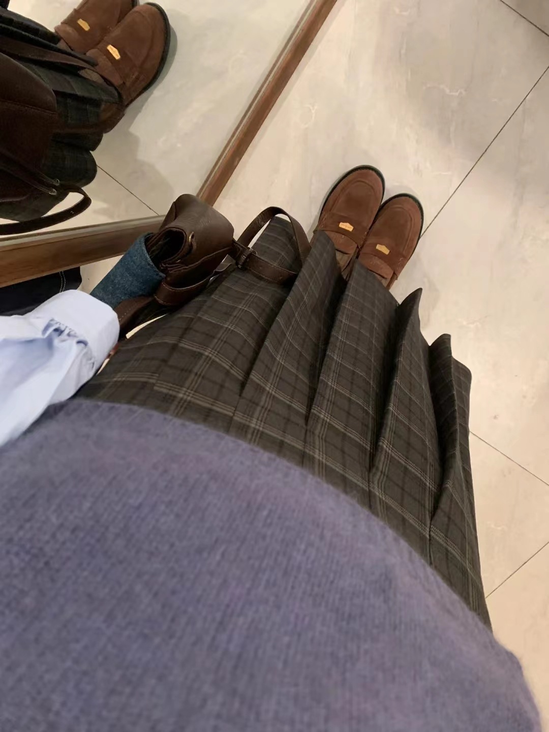 首尔高校生Luca格纹复古高腰a字裙灰色长裙秋冬压褶长款半身裙女