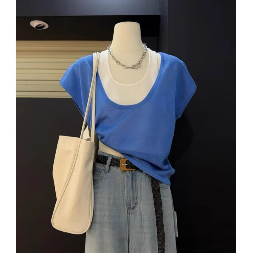 韓国シックでユニークな美しいフェイクツーピースショートトップ女性の夏黄色ニット半袖Tシャツ