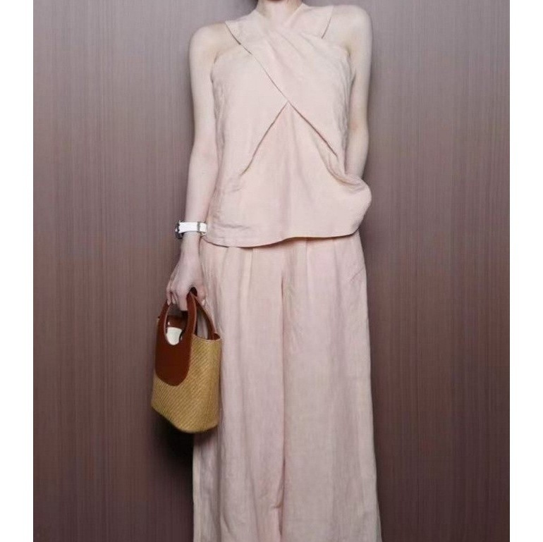 ヨーロピアンスタイルのファッショナブルな女性用サマースーツ、クロスホルターネックベストトップ、ハイウエストフロアレングスワイドレッグパンツ、ツーピーストレンディセット