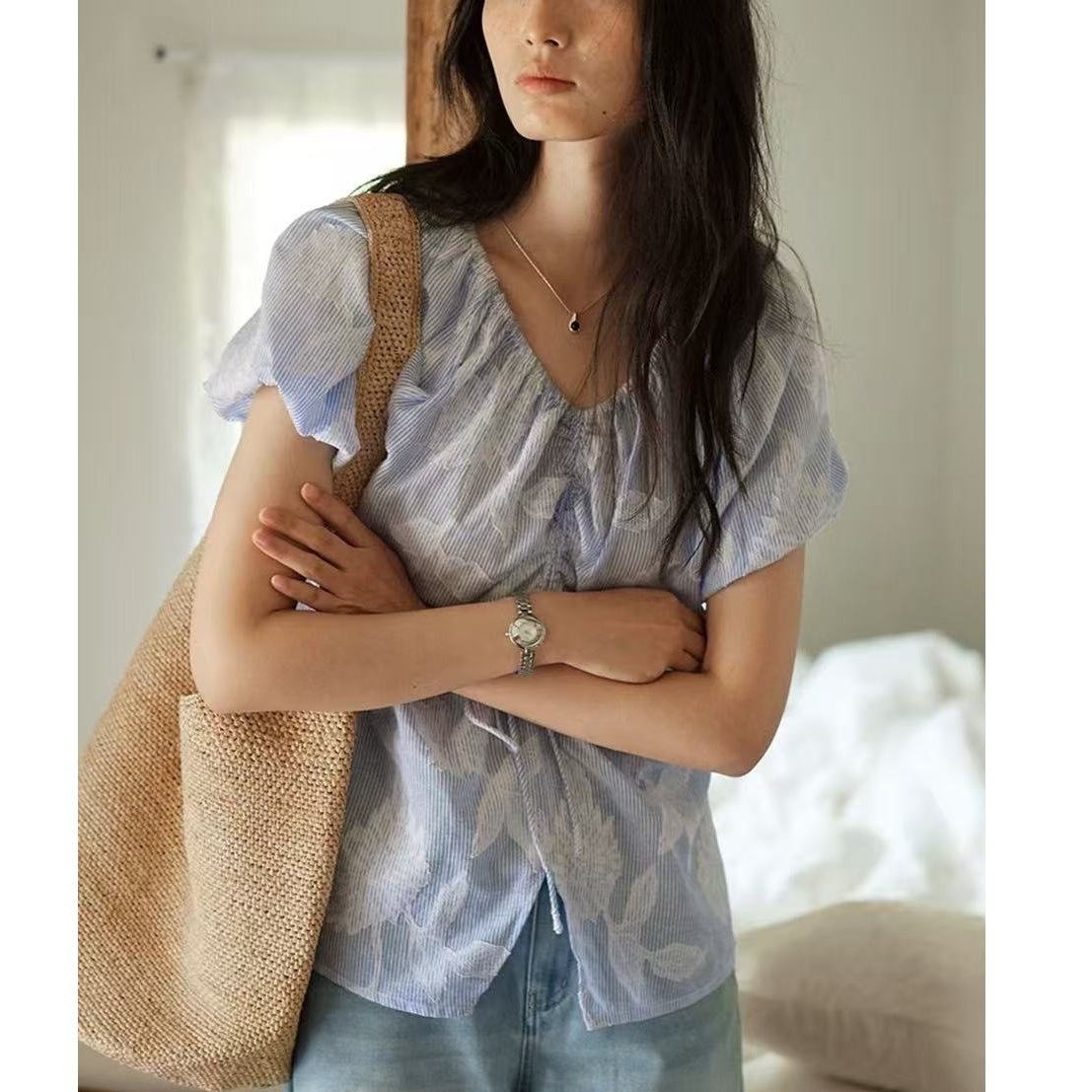 ソリガーフレンチストライプカットアウトレースアップVネックシャツレディース夏パフスリーブレトロアーティスティックトップス