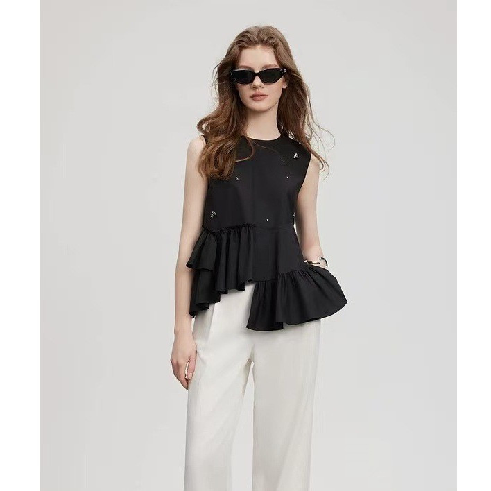 モダンなビーズフリルノースリーブシャツ女性のための 2025 夏の新しい不規則なデザインファッショナブルなシャツ