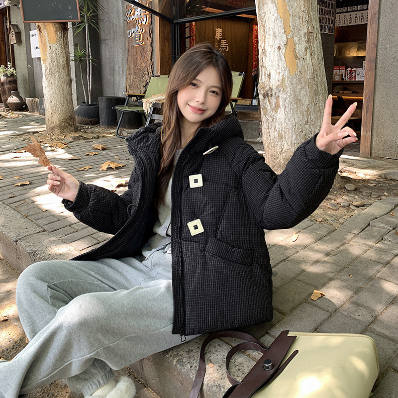 2025新款连帽羽绒棉服蓝色格子面包服冬季外套女短款棉服棉衣夹克