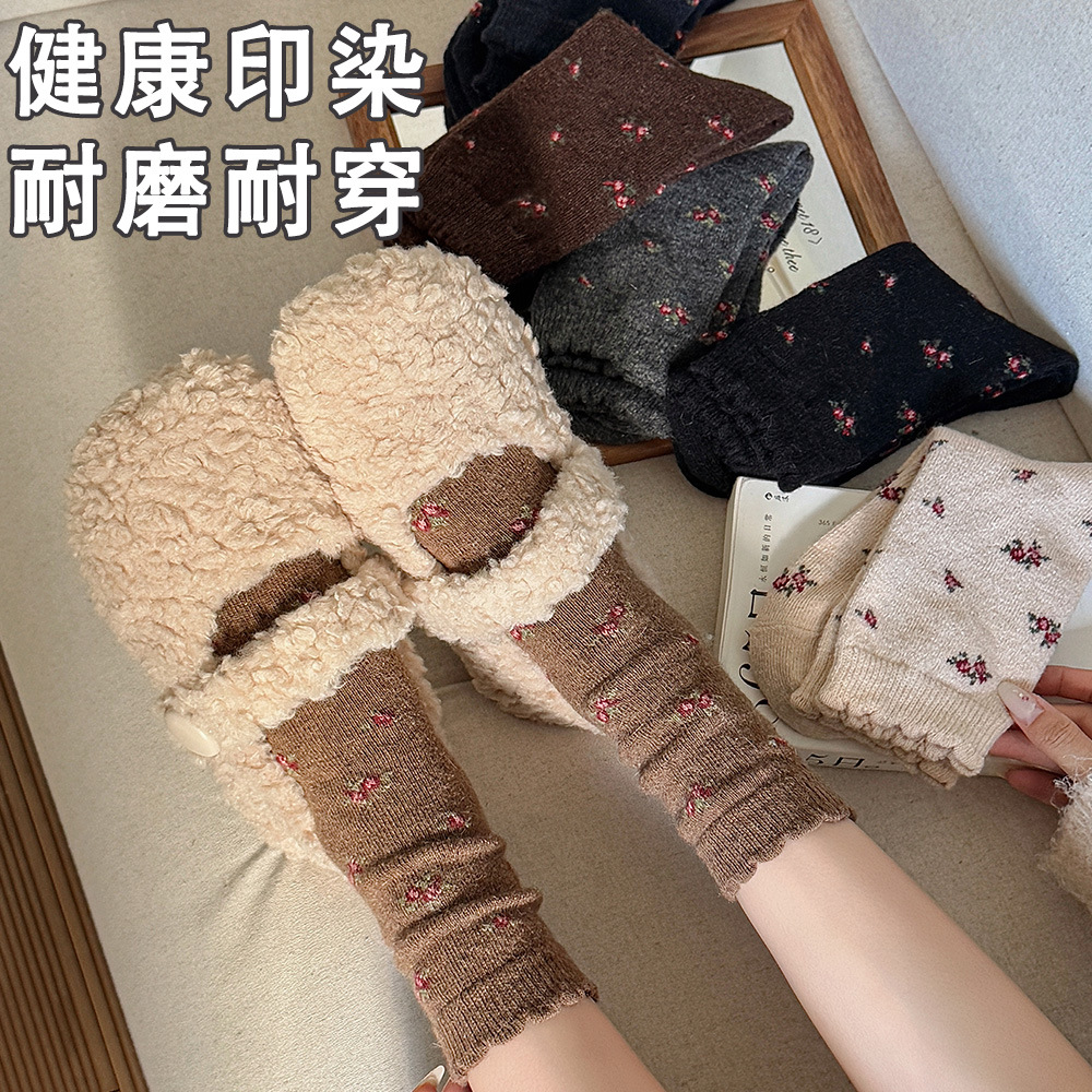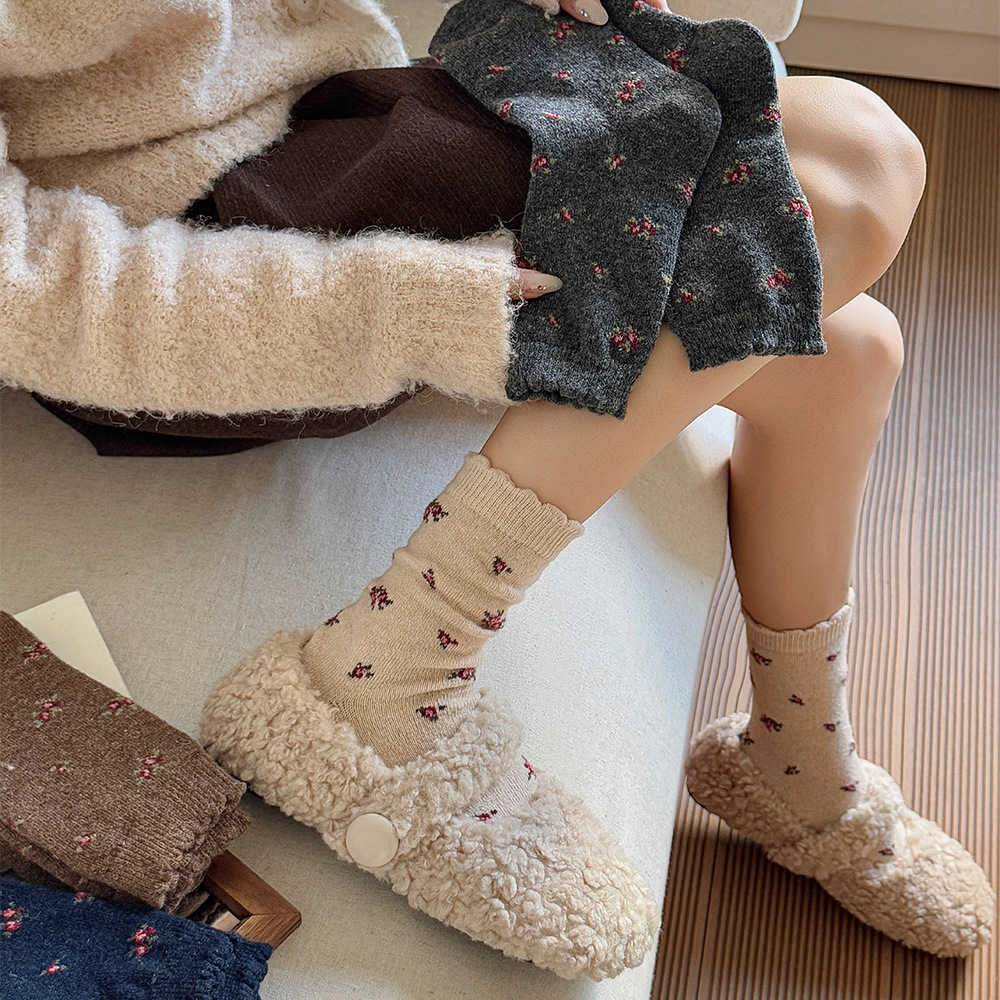 复古碎花羊毛袜堆堆袜秋冬加厚保暖韩系碎花小众原创花边袜配勃肯