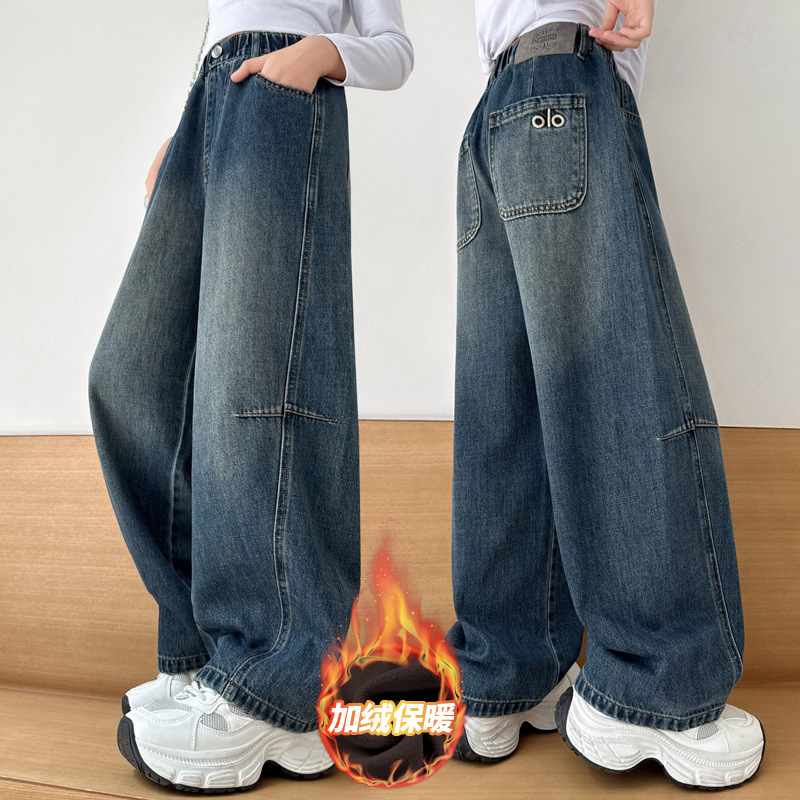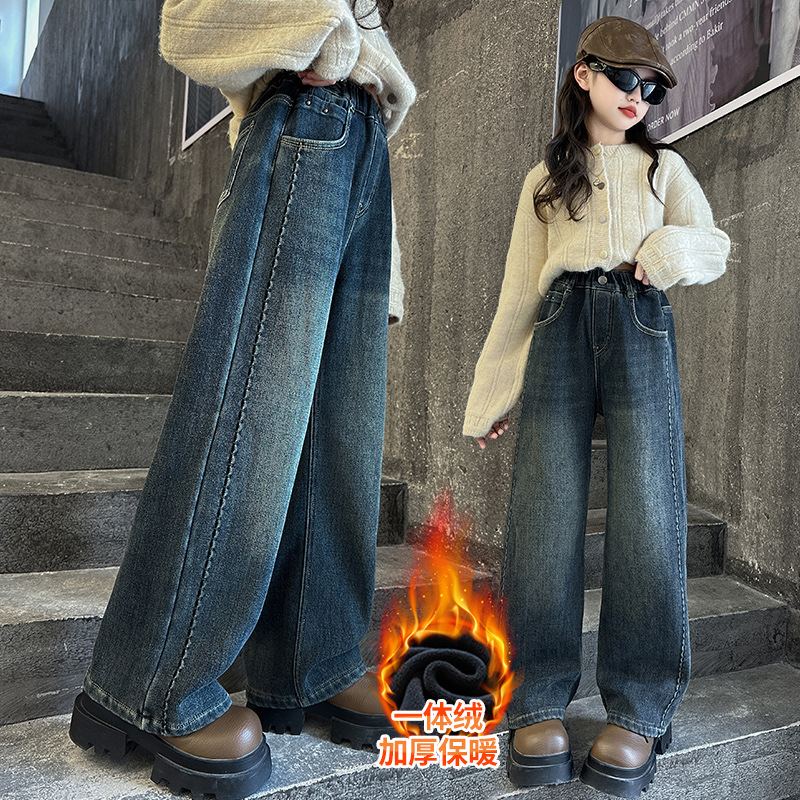 女童冬季加绒裤子2025新款儿童牛仔裤初中生女孩大童秋冬款直筒裤