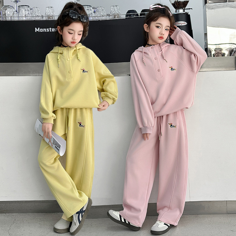 2026年春秋向け、女の子用クロスボーダースポーツウェア、おしゃれでゆったりとしたカジュアルなフード付きスウェットシャツとカーブドパンツのツーピースセット