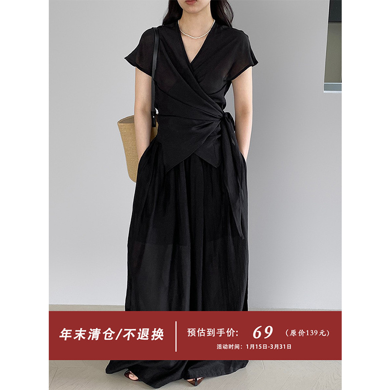 【特典商品・返品交換不可】江左 ニッチデザインVネックタイ付きシャツ+ワイドパンツ2点セット 6278