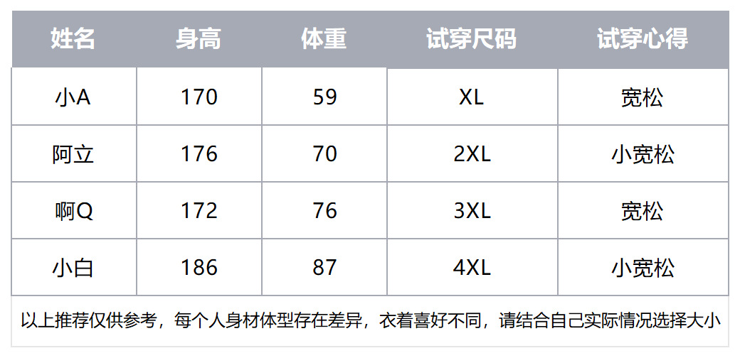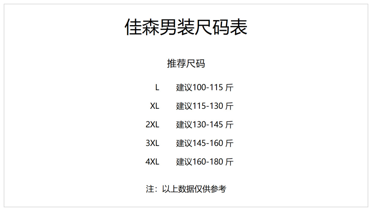尺码 L 【建议100-115斤内】,XL 【建议115-130斤内】,2XL 【建议130-145斤内】,3XL 【建议145-160斤内】,4XL 【建议160-180斤内】