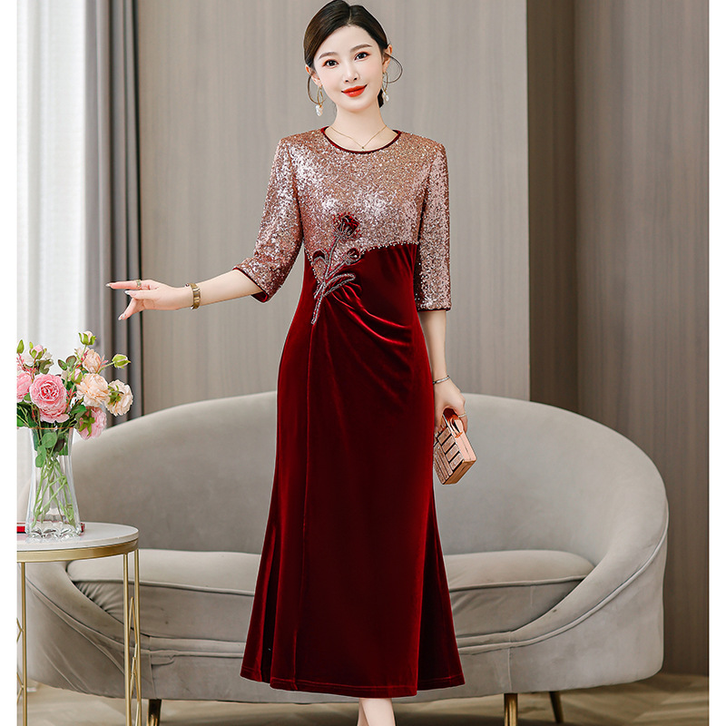 yqwl6951喜婆婆婚宴装礼服裙2025秋季新款重工亮片丝绒连衣裙女