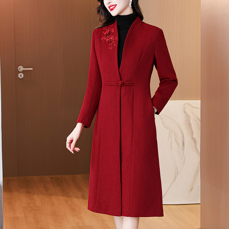 qwfs7632酒红色毛呢外套喜婆婆2025冬季时尚减龄气质修身长款大衣