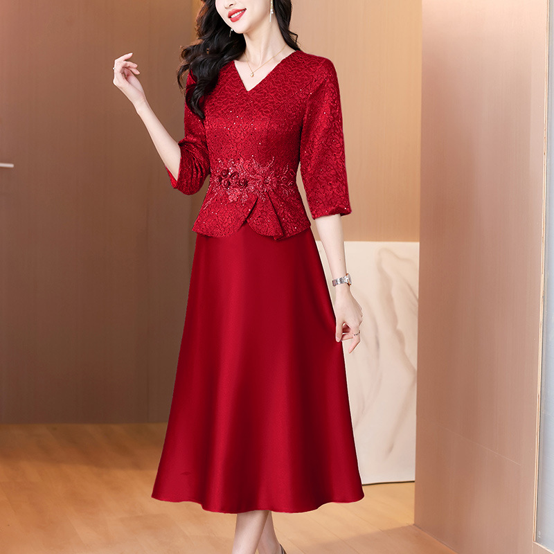 喜姑の結婚披露宴の赤いドレスのスカート2023秋の新型のお母さんの服のファッションの復古の修身の中で長いスカート