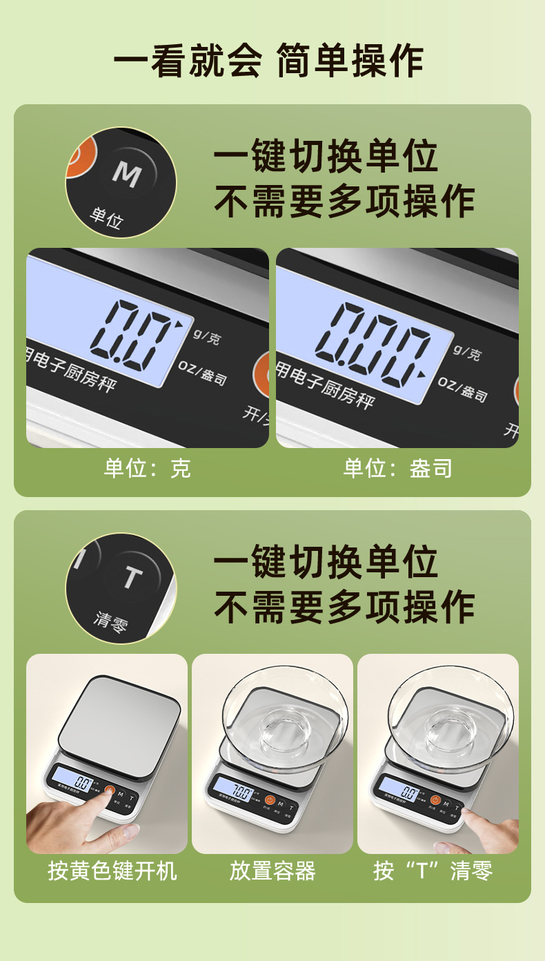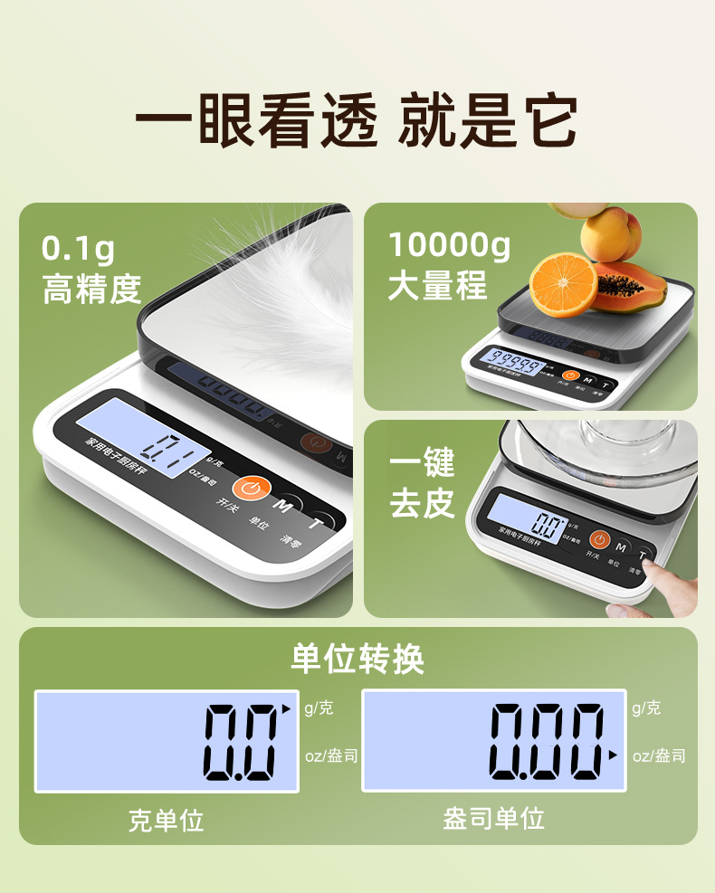 功能 去皮,过载保护,自动关机,低电量提醒,单位转换,精准称重