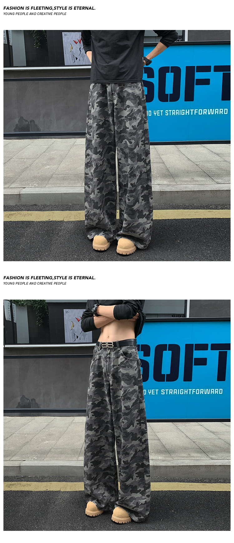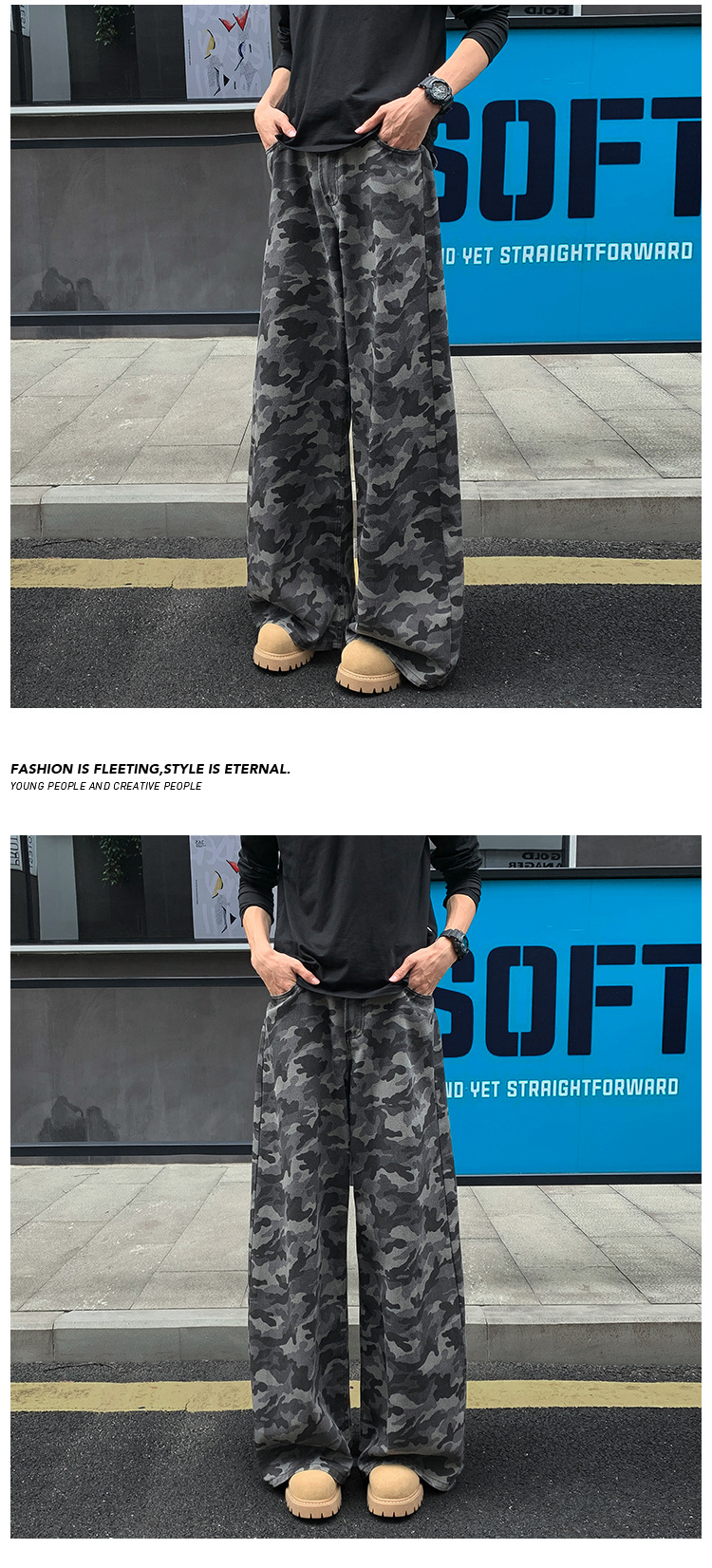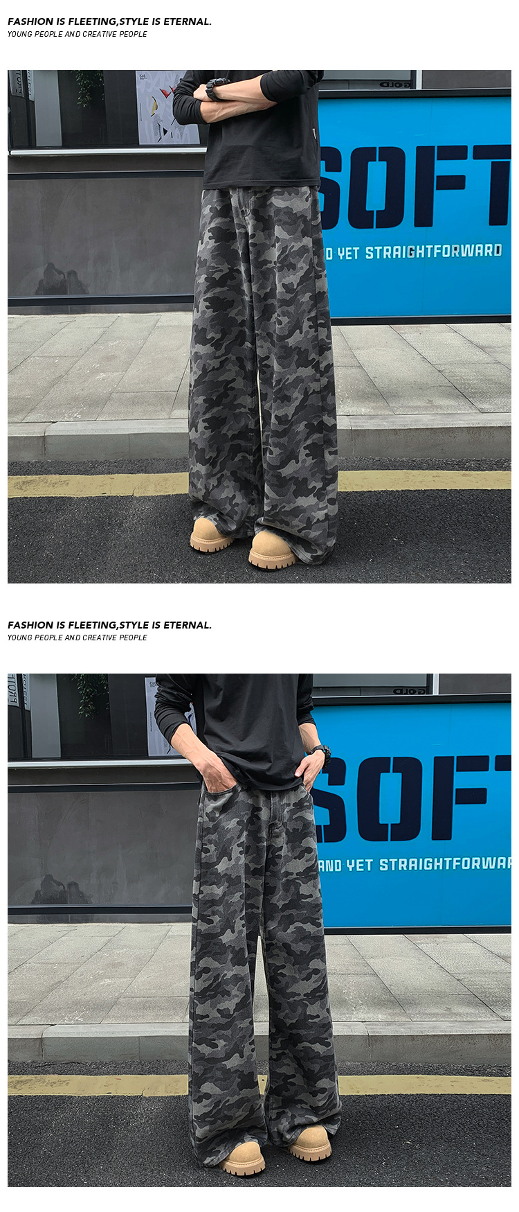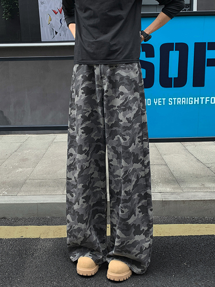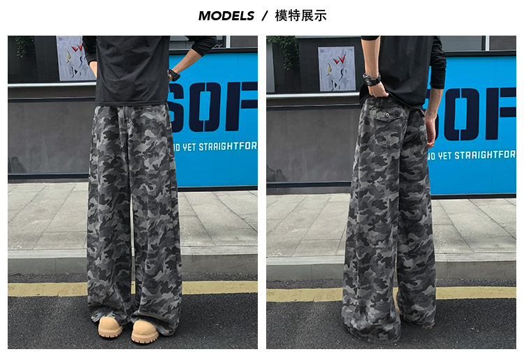 美式迷彩牛仔裤男秋季高街潮牌大码宽松阔腿拖地长裤弯刀裤子男款