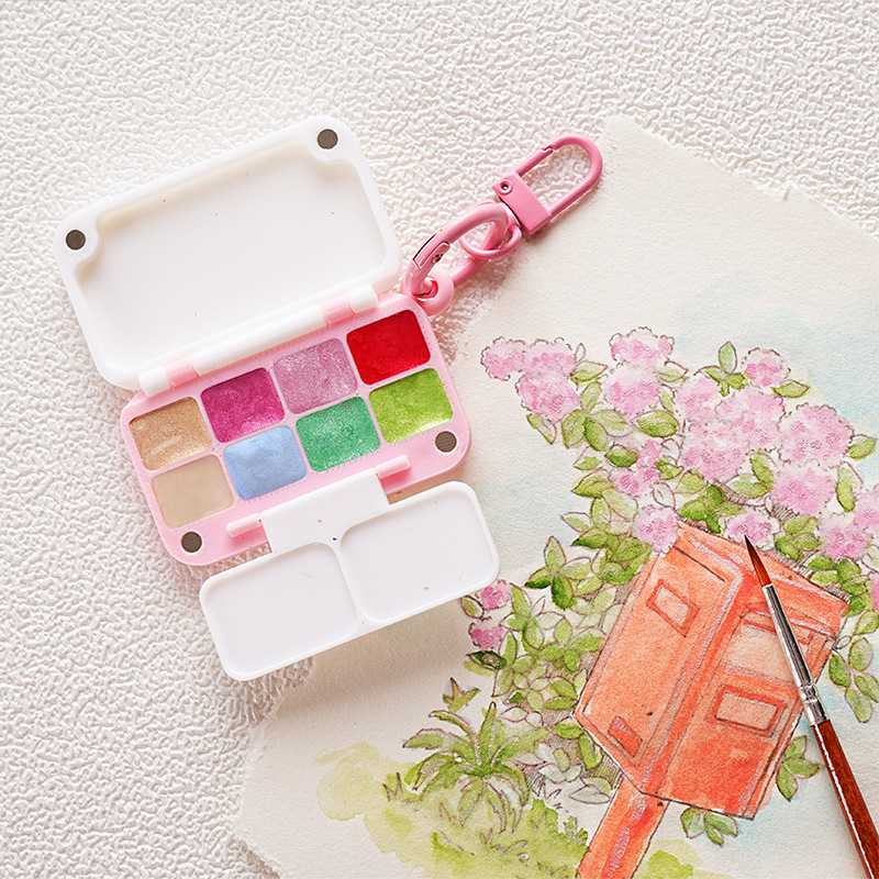 迷你珠光水彩颜料盒8色美术写生颜料调色盘分装盒随身便携调色盒