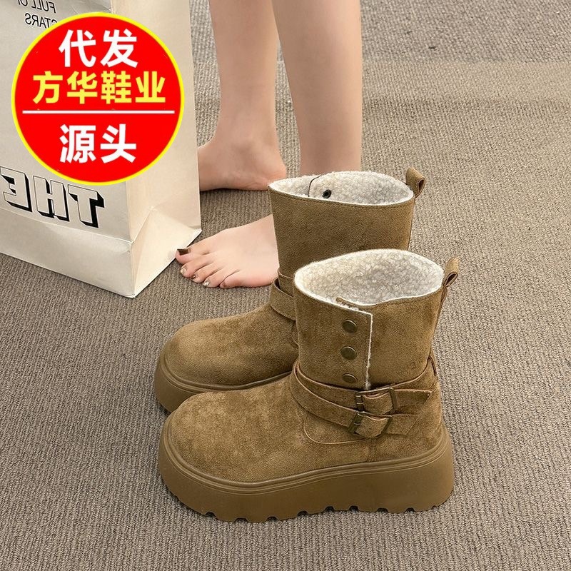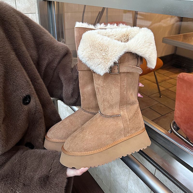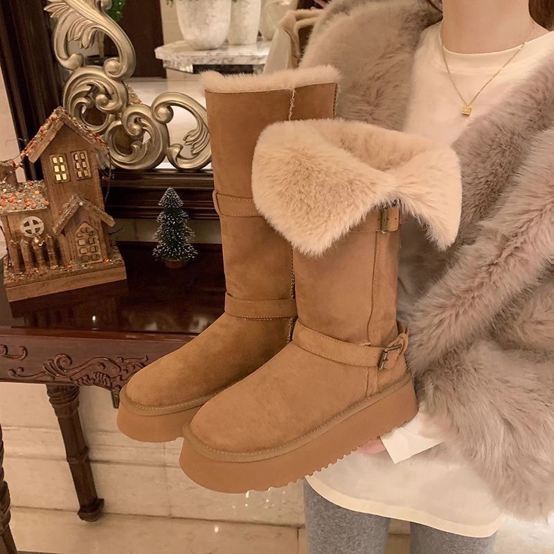 厚底长筒雪地靴女2025冬季新款加绒保暖毛毛短靴扣带装饰东北棉靴