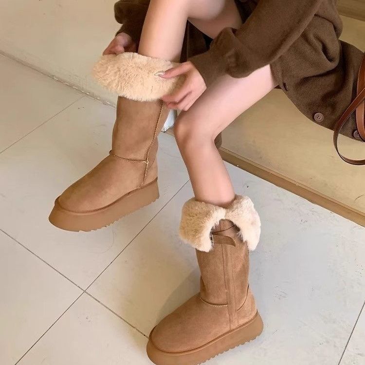 2025年秋冬新款中高筒雪地靴女皮毛一体休闲加绒保暖厚底加厚长靴