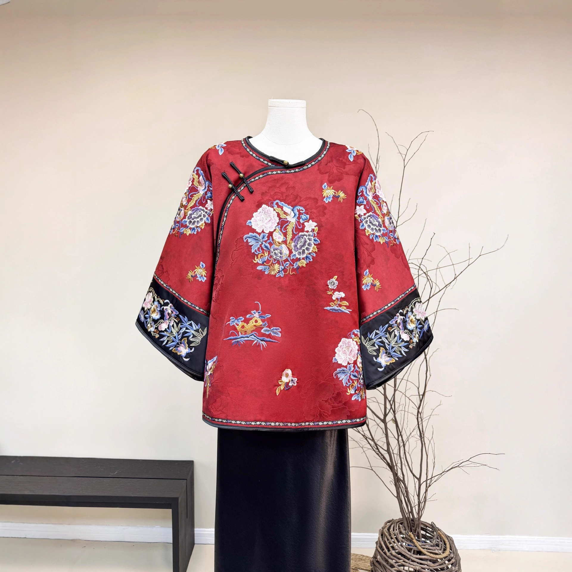 新中式重工刺绣提花富贵短袖棉外套2025冬季新款圆领斜襟保暖
