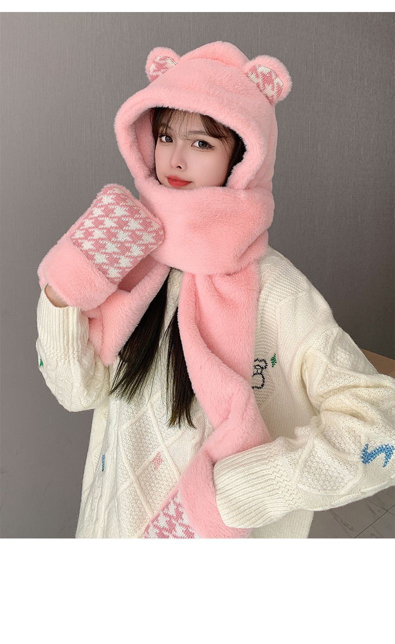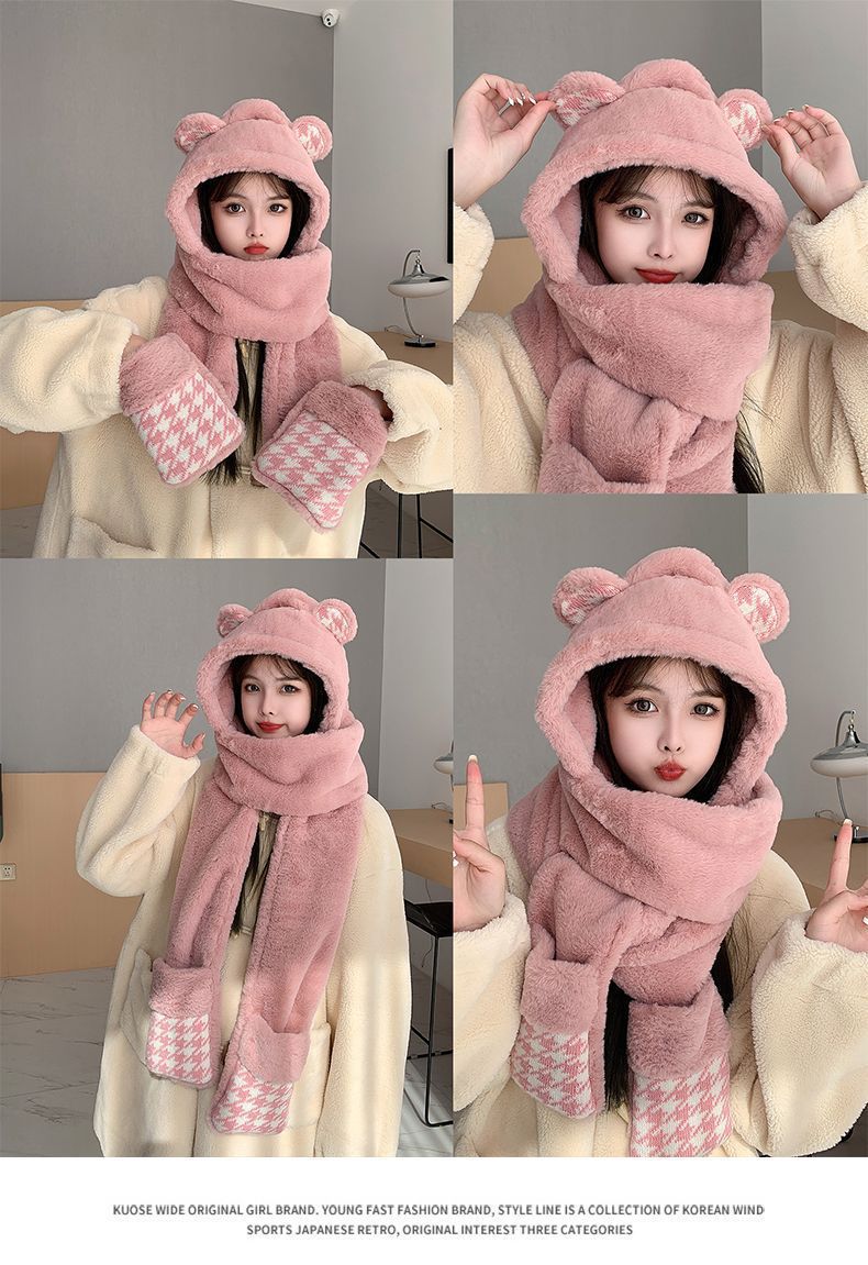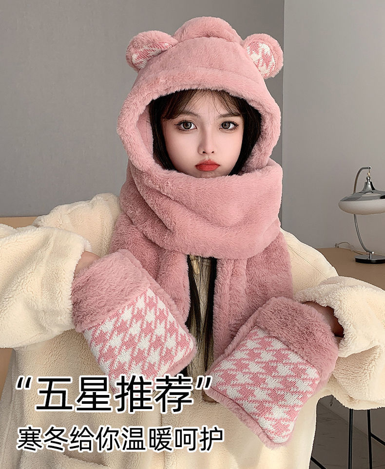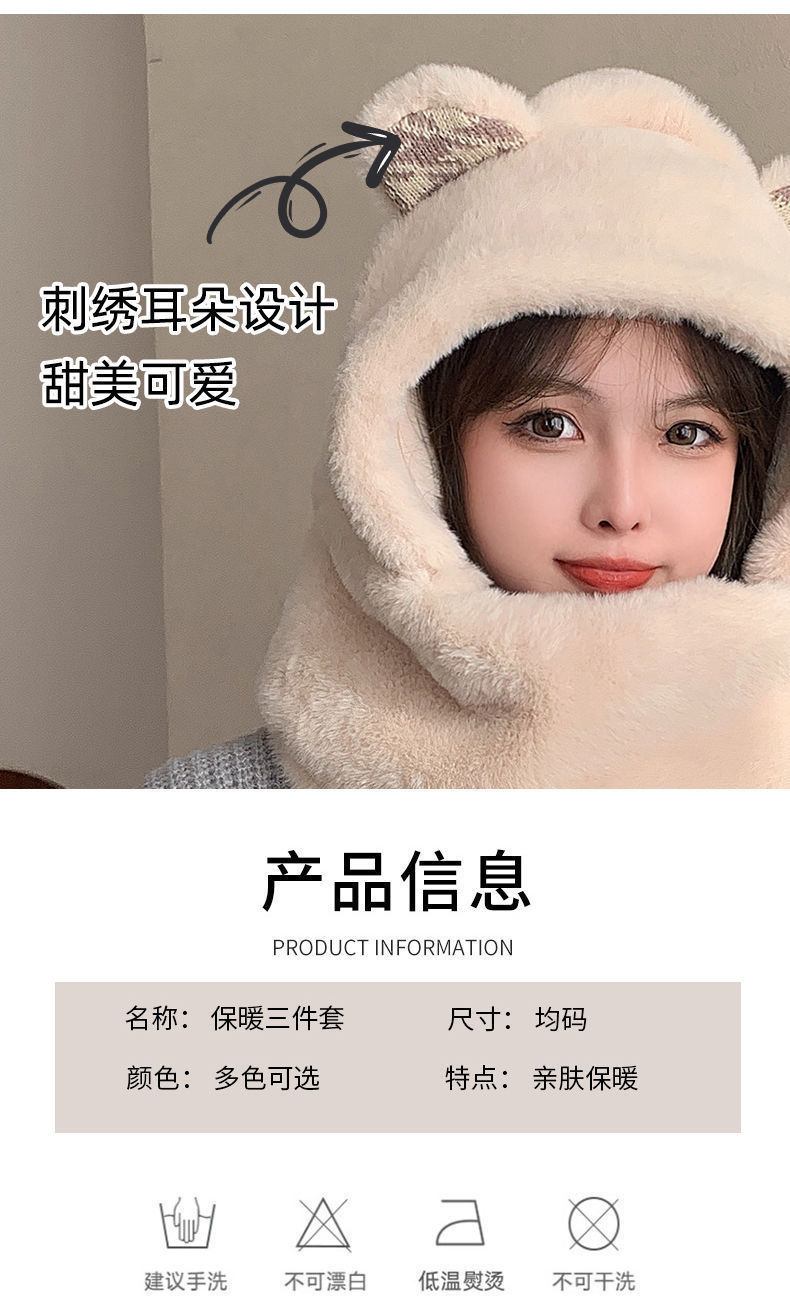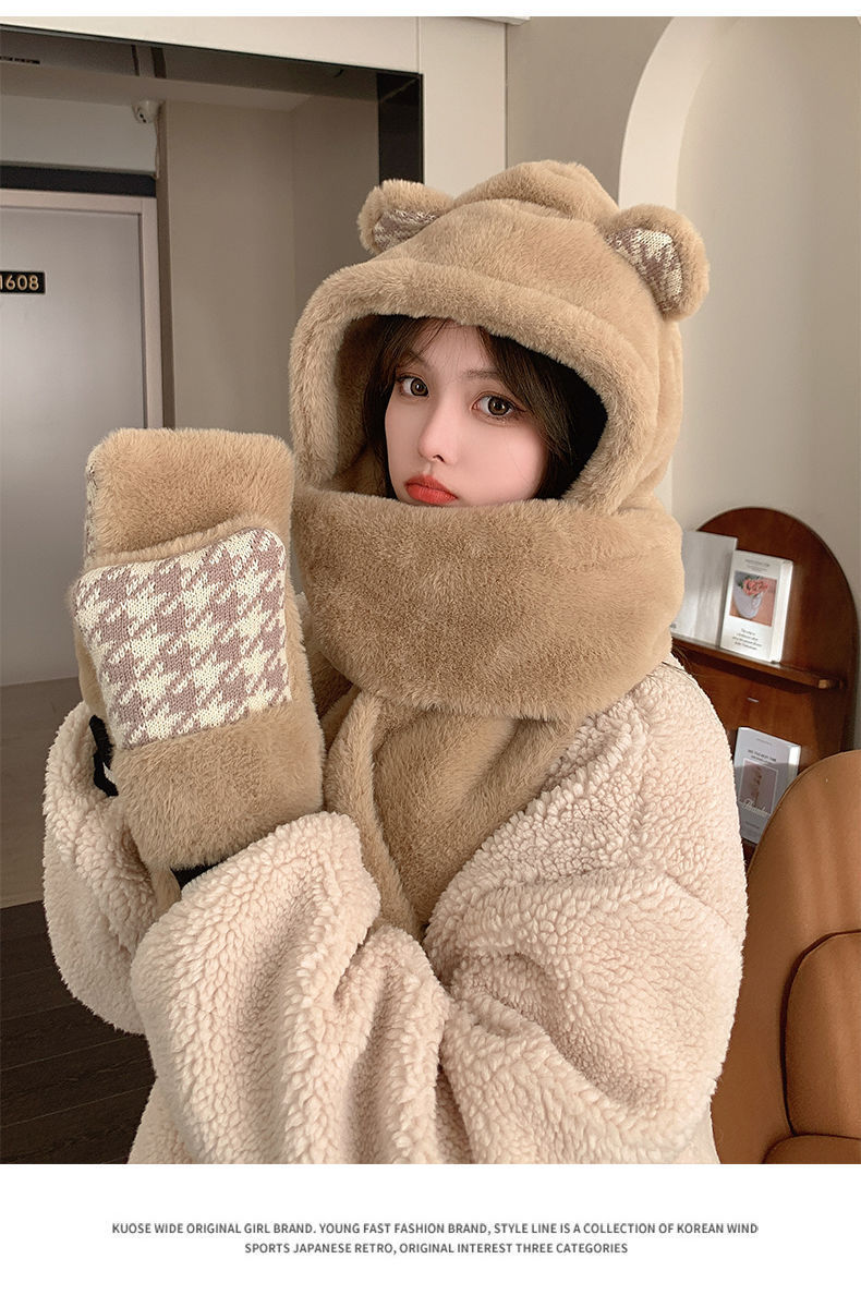 可爱小熊帽子女保暖帽子围巾手套一体帽子冬季可爱加绒保暖防护帽