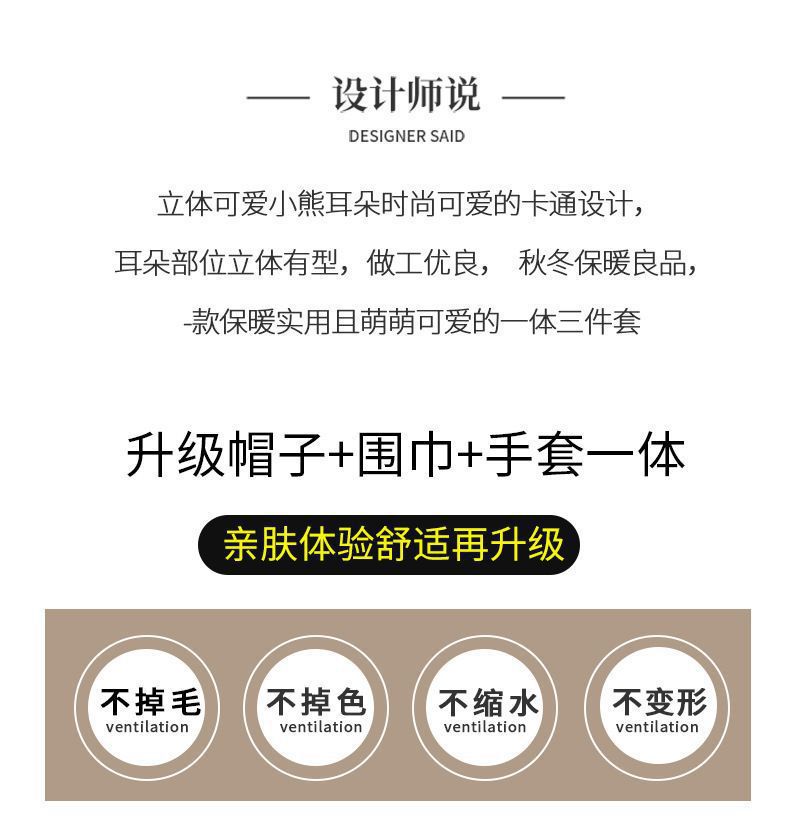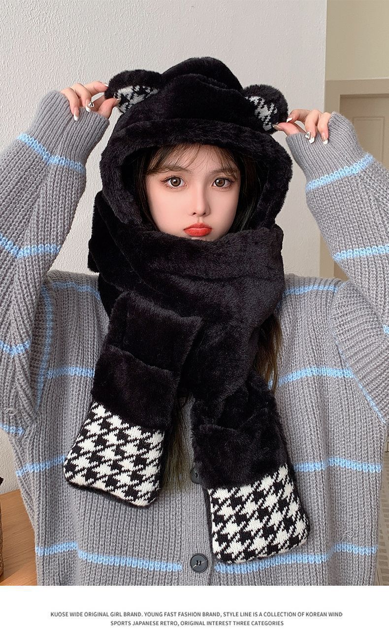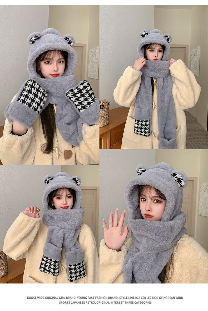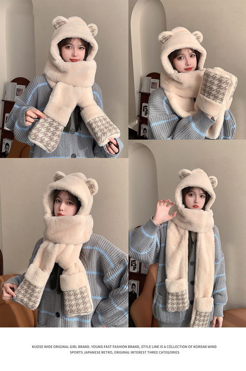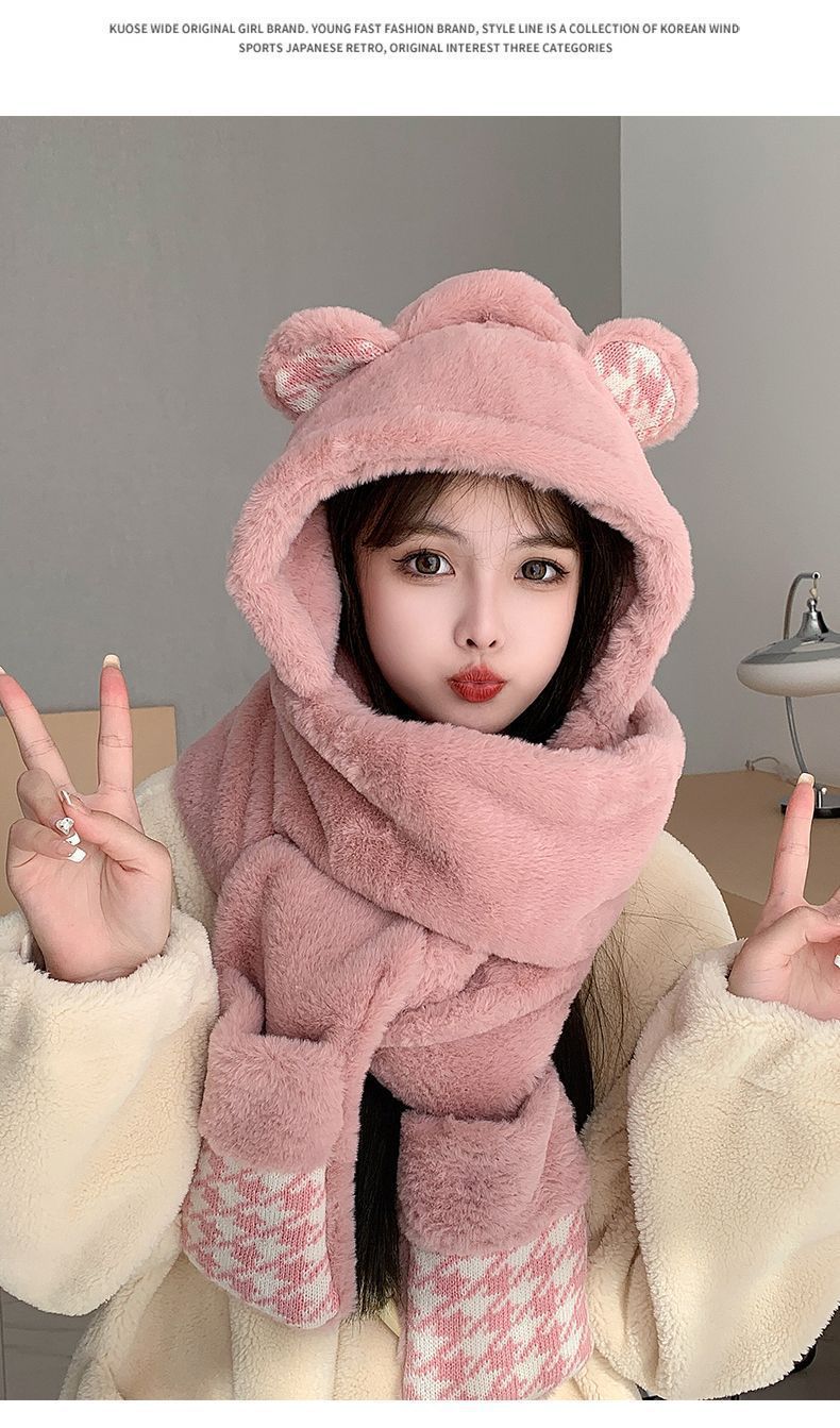 可爱小熊帽子女保暖帽子围巾手套一体帽子冬季可爱加绒保暖防护帽