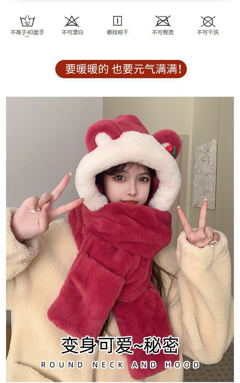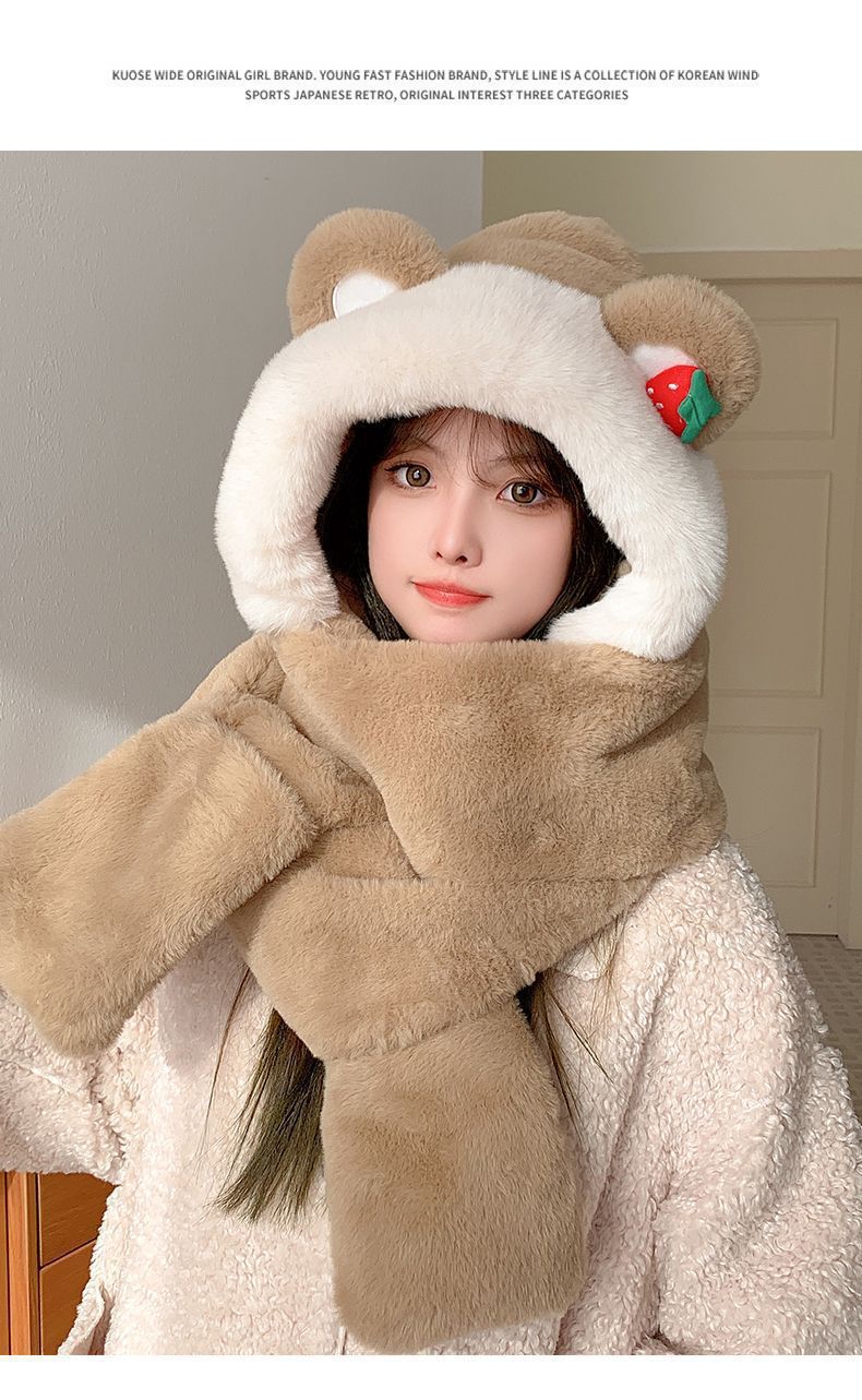 冬用3点セット いちごクマ耳付き3in1スカーフ帽子 防寒暖かい包頭帽 レディース 冬用手袋付きフード付き