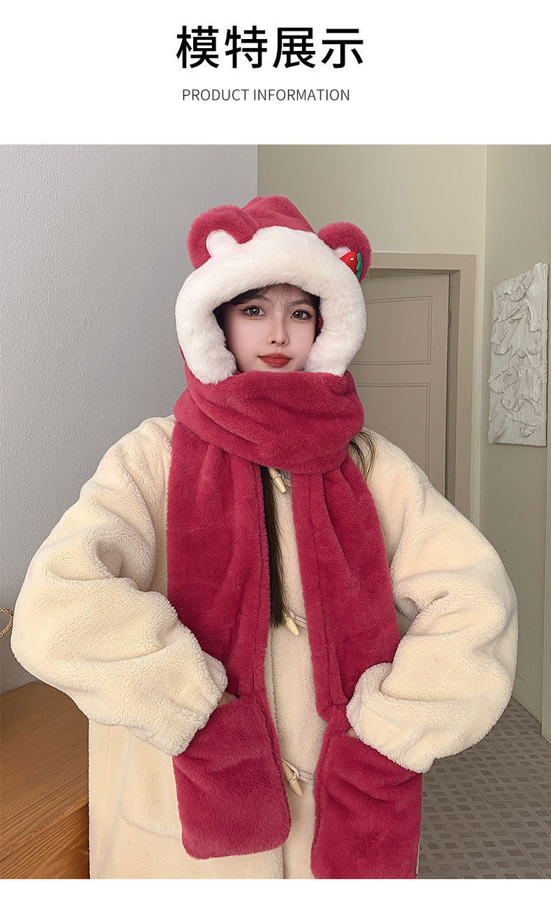 帽子女冬いちご熊新年クリスマス帽三点セット冬かわいいマフラー帽子保温手袋三合一