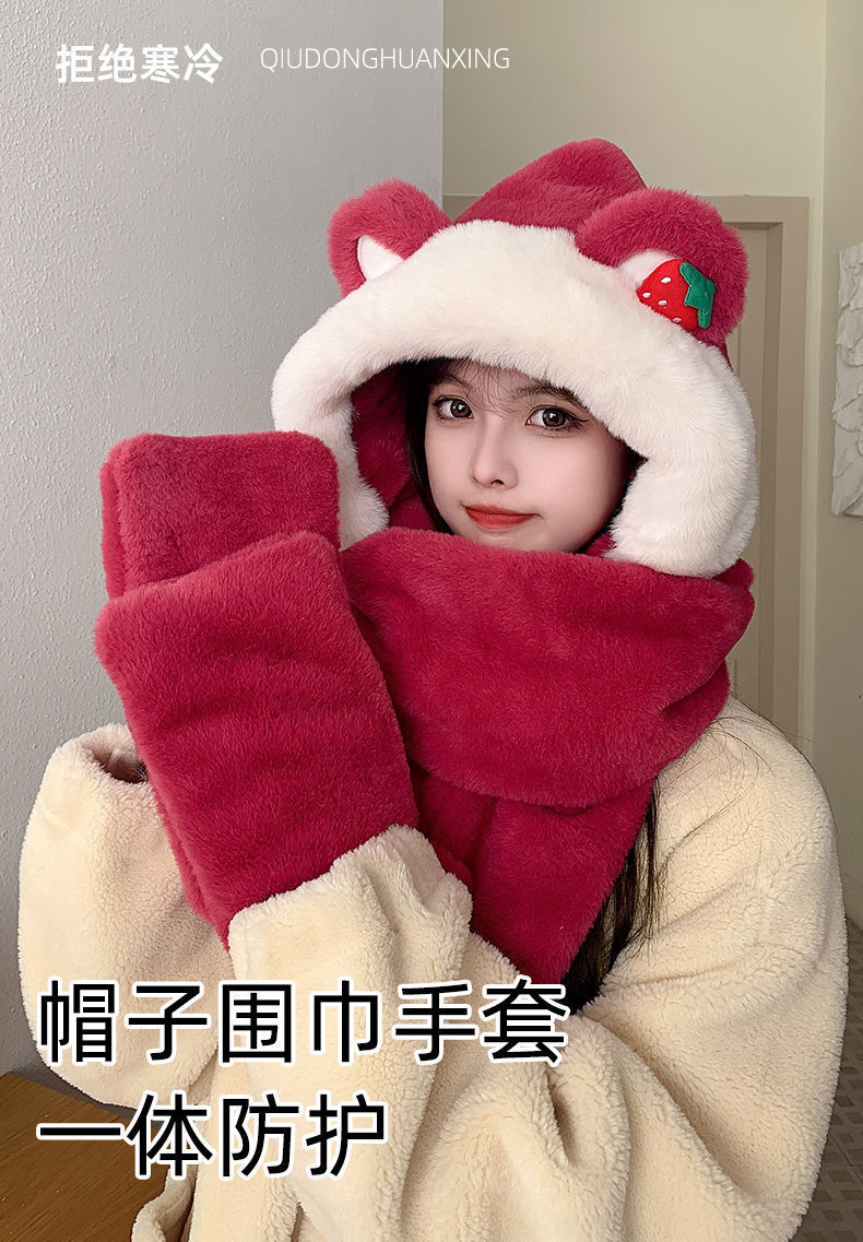 帽子女冬季草莓熊新年圣诞帽三件套冬天可爱围巾帽保暖手套三合一