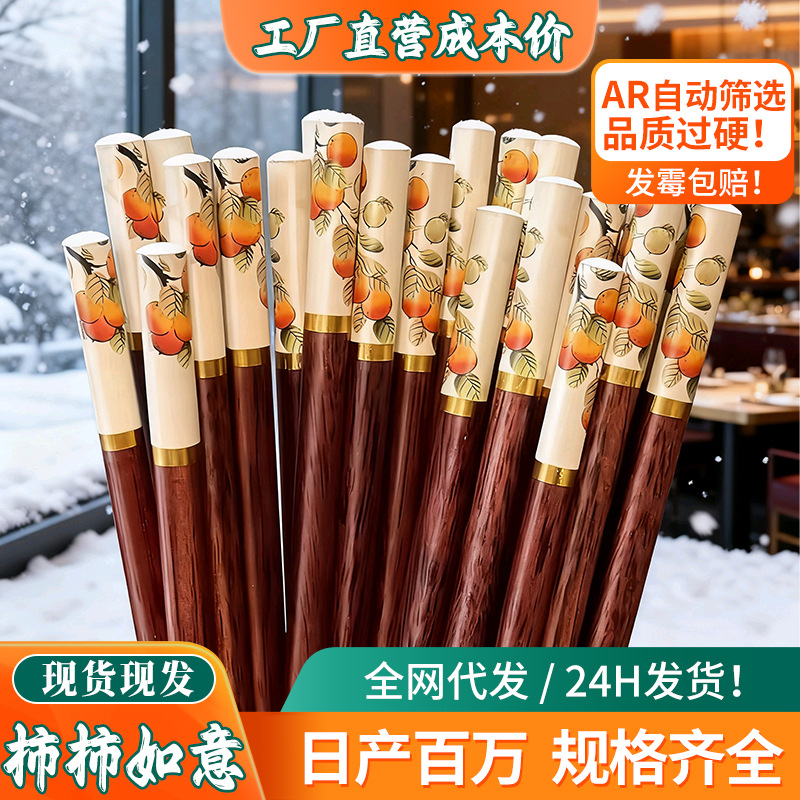 实木筷子家用中式柿柿如意2025新款防霉防滑高档家庭装加粗抗菌款