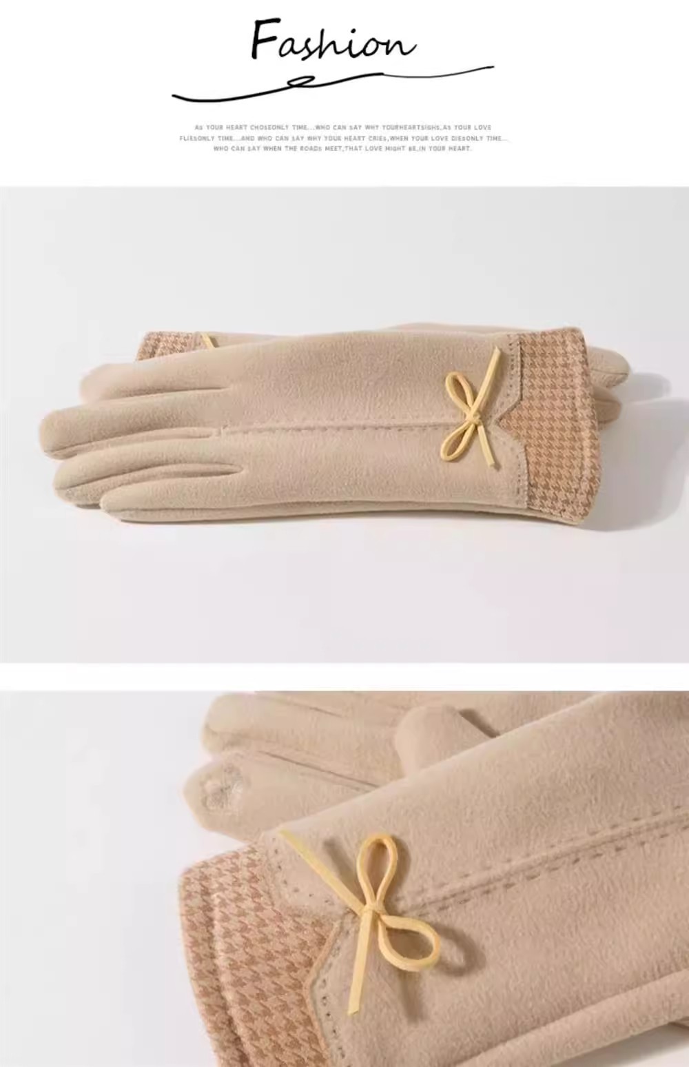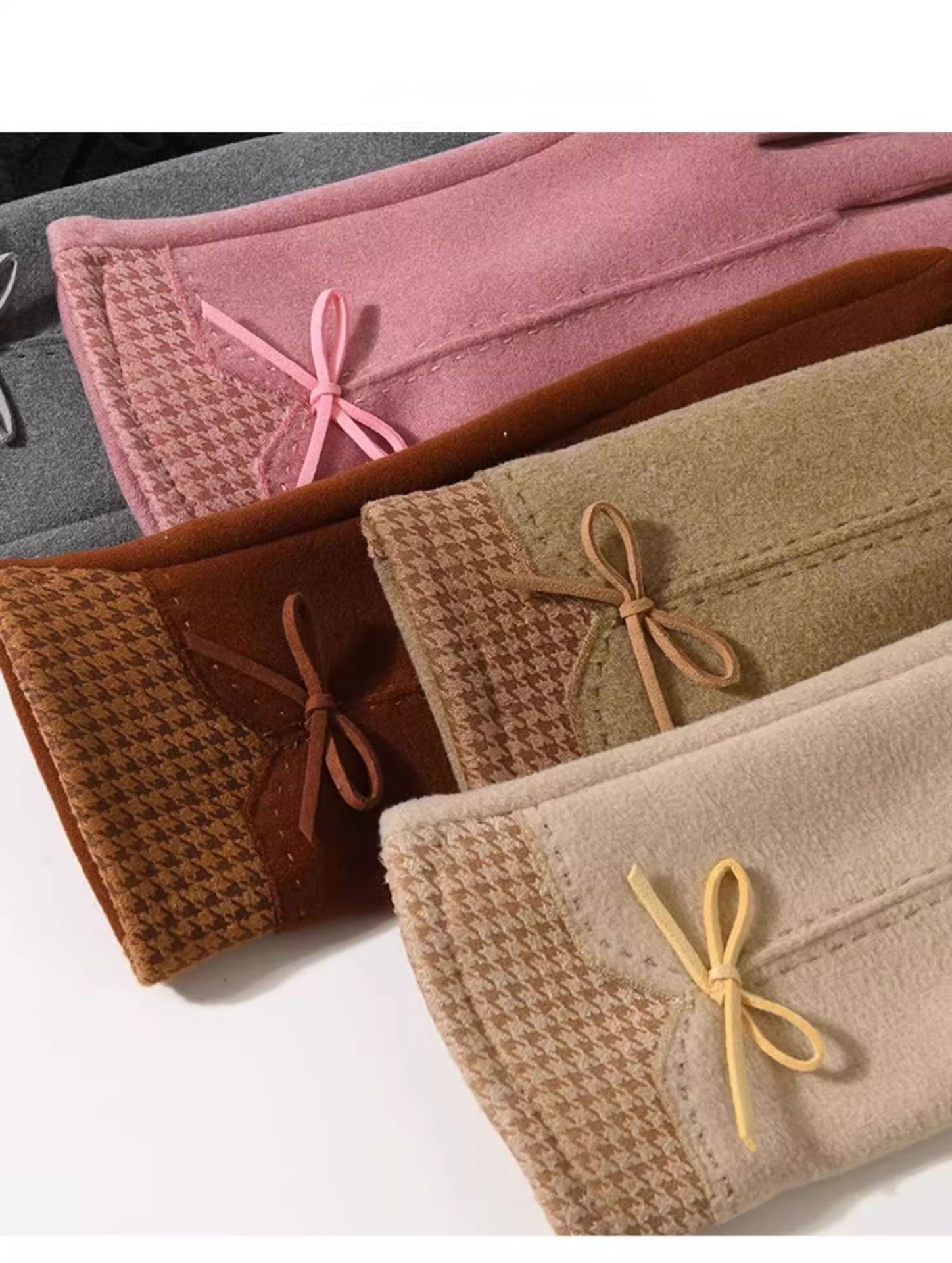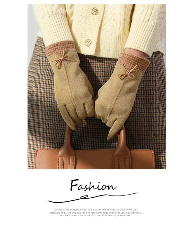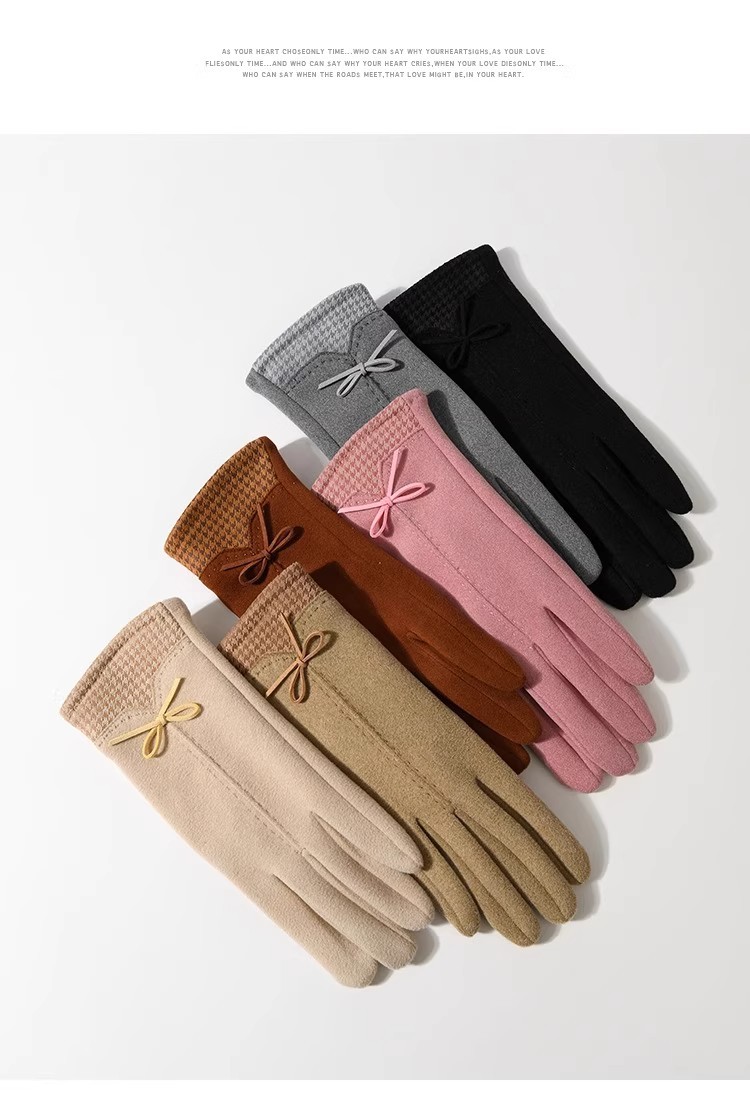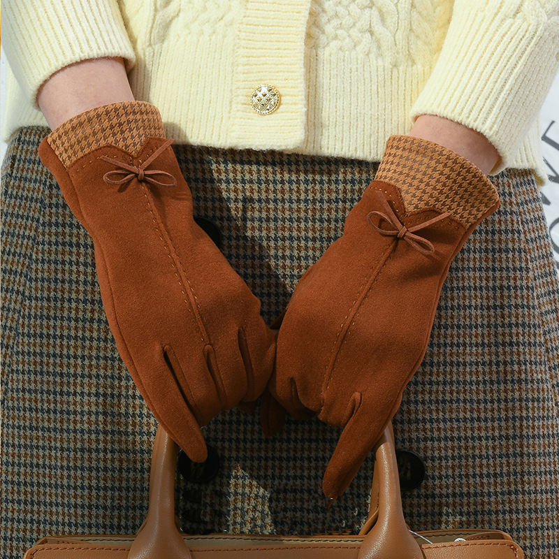 高級感知性千鳥格蝶結びデザイン毛皮のベルベット女性手袋冬保温タッチパネル