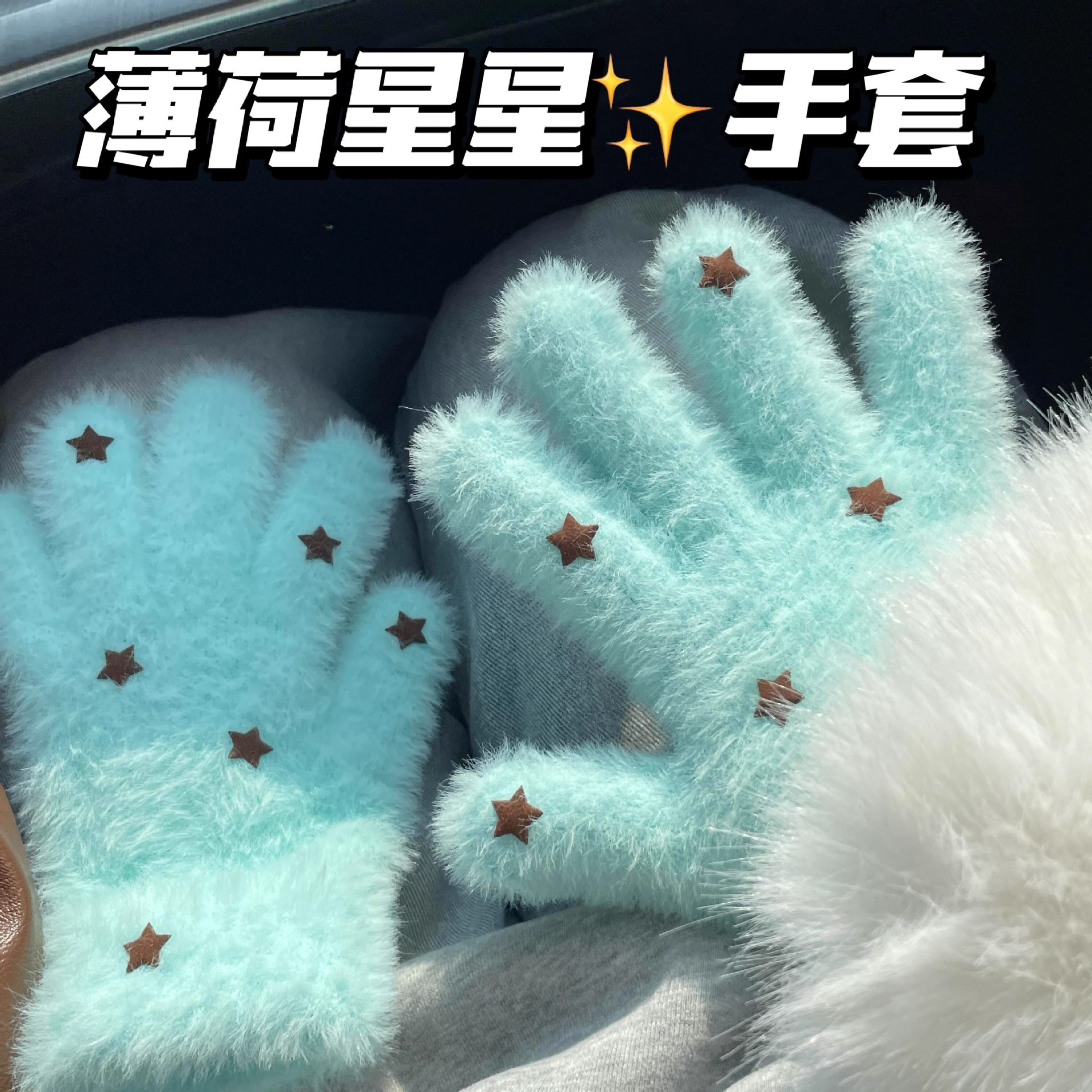 新款薄荷绿星星毛绒手套冬季防寒保暖手套可爱加厚高颜值分指手套