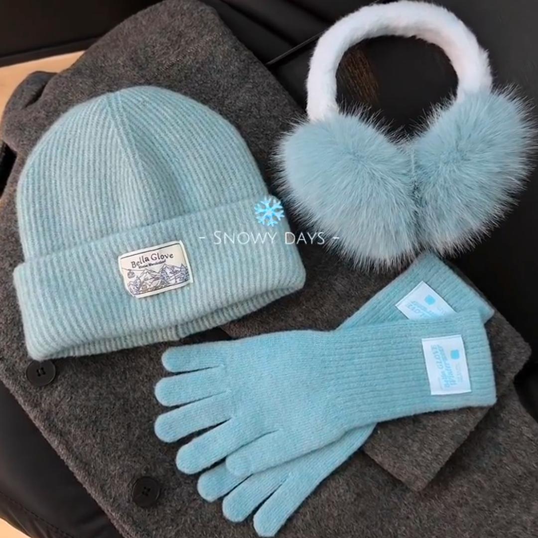 过冬三件套!冰岛蓝保暖针织帽子女加厚款毛线手套可触屏毛绒耳罩