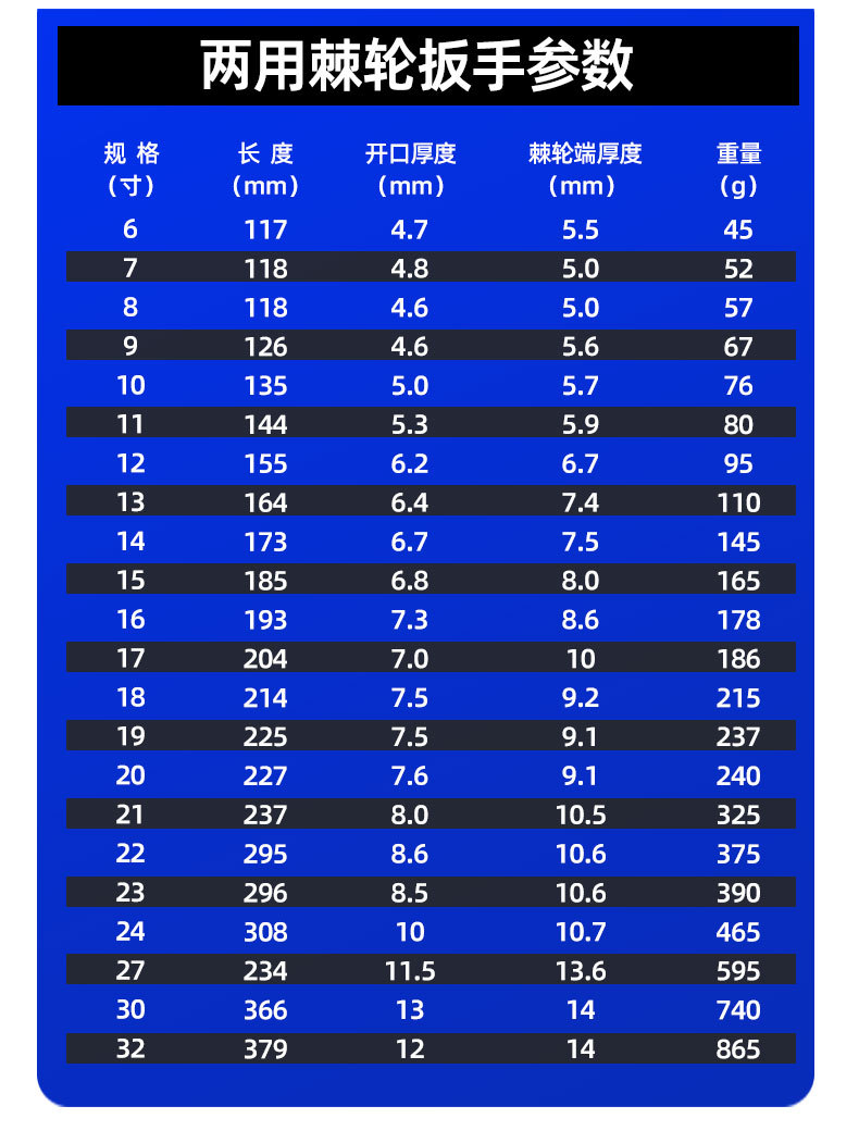 规格型号 1810,两用棘轮扳手6mm,0.045kg,1811,两用棘轮扳手7mm,0.052kg,1812,两用棘轮扳手8mm,0.057kg,1813,两用棘轮扳手9mm,0.067kg,1814,两用棘轮扳手10mm,0.076kg,1815,两用棘轮扳手11mm,0.08kg,1816,两用棘轮扳手12mm,0.095kg,1817,两用棘轮扳手13mm,0.11kg,1818,两用棘轮扳手14mm,0.145kg,1819,两用棘轮扳手15mm,0.165kg,1820,两用棘轮扳手16mm,0.178kg,1821,两用棘轮扳手17mm,0.186kg,1822,两用棘轮扳手18mm,0.215kg,1823,两用棘轮扳手19mm,0.237kg,1824,两用棘轮扳手20mm,0.24kg,1825,两用棘轮扳手21mm,0.325kg,1826,两用棘轮扳手22mm,0.375kg,1827,两用棘轮扳手23mm,0.39kg,1828,两用棘轮扳手24mm,0.465kg,1829,两用棘轮扳手25mm,0.535kg,1830,两用棘轮扳手26mm,0.545kg,1831,两用棘轮扳手27mm,0.595kg,1832,两用棘轮扳手30mm,0.74kg,1833,两用棘轮扳手32mm,0.865kg