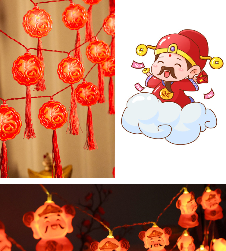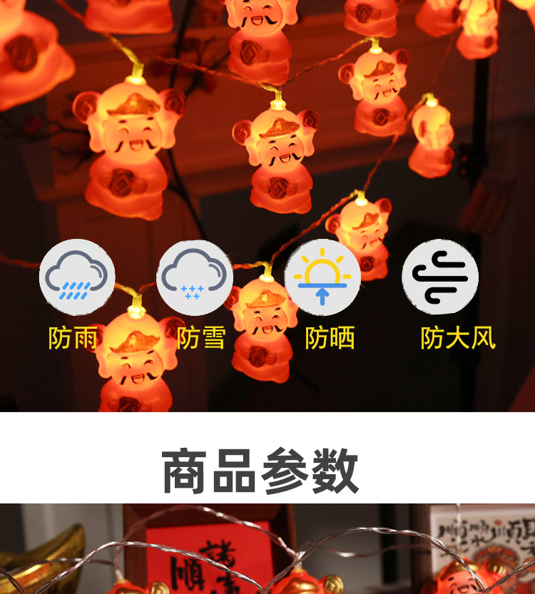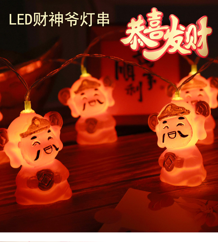 春节LED财神爷元宝发财灯串 太阳能新年户外福字流苏红灯笼彩灯串